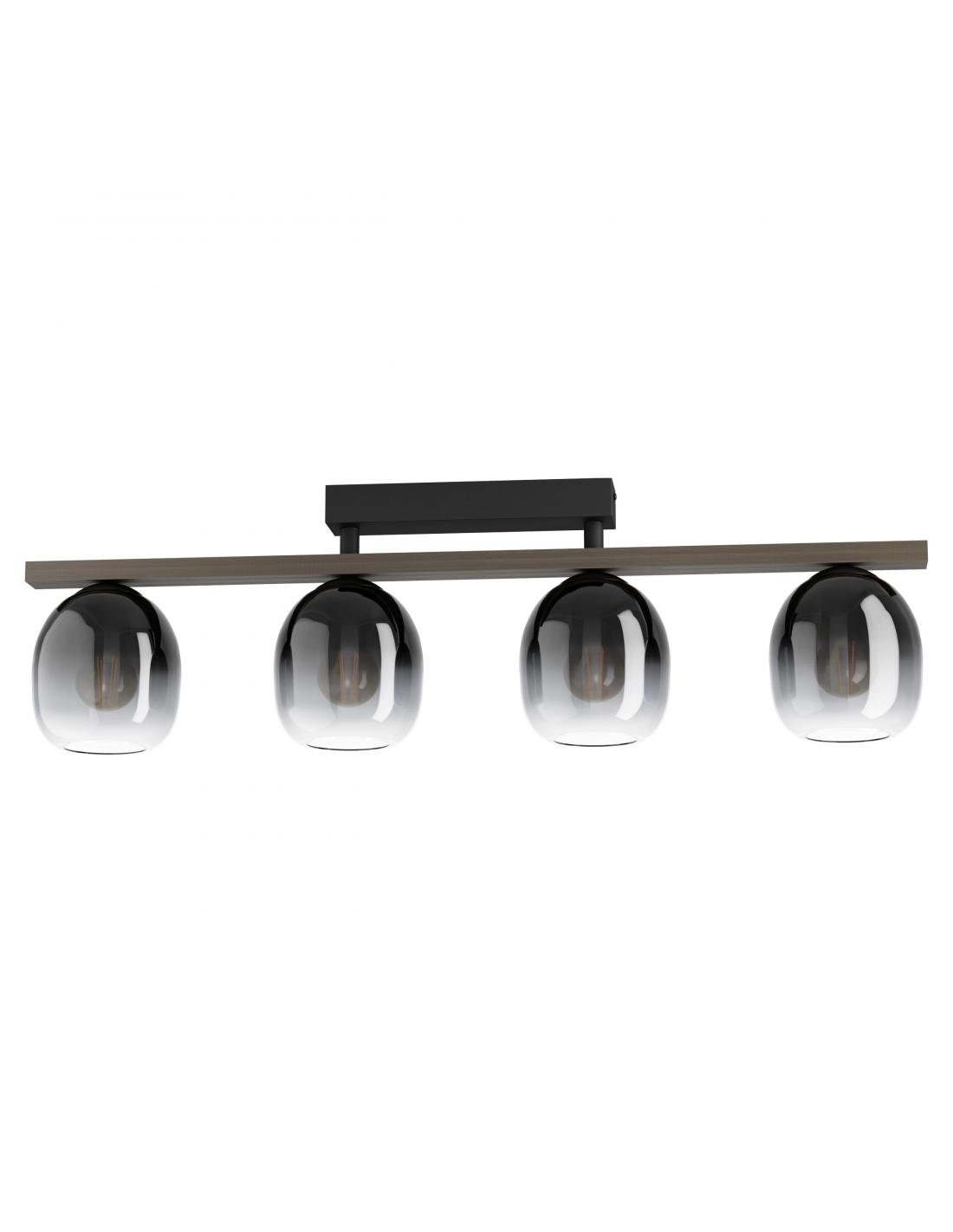 The FILAGO ceiling lamp is made up of a walnut brown pine wood beam combined with four round glass shades with black-transparent gradient. The black metal base skillfully completes the elegant look of the ceiling lamp. It fits perfectly into modern décor styles and offers evocative lighting in any room, whether in the kitchen, living room, bedroom or hallway. Bulbs are not included. The lamp is suitable for any bulb with an E27 socket.