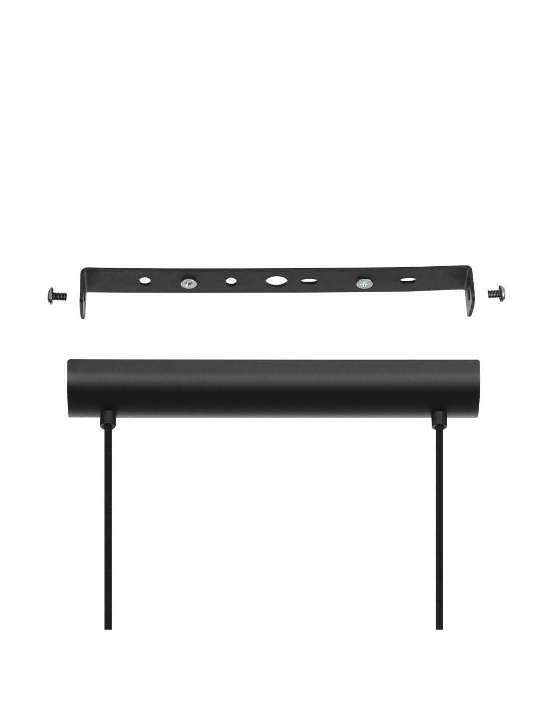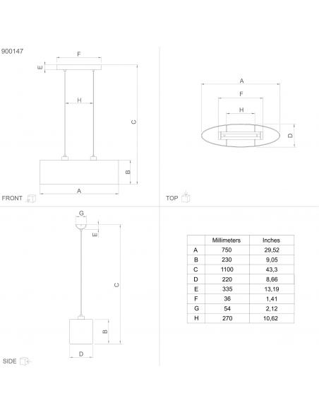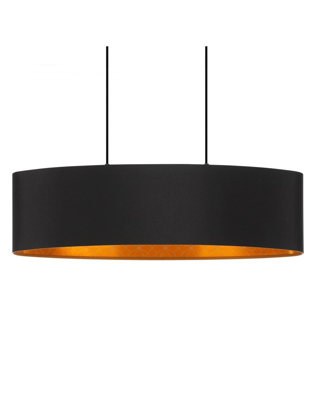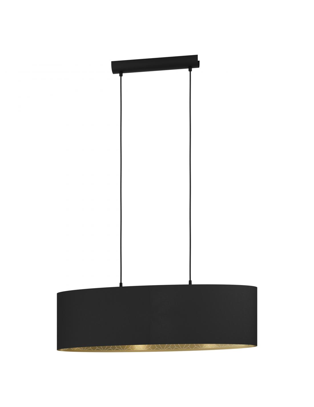 Two-light hanging lamp with textile shade in black color with gold interior engraved with geometric motifs. An elegant and functional piece that will decorate your room as well as illuminate it with its power of two lights. Adjustable height wiring and black steel base. Requires two e27 socket bulbs, not included.