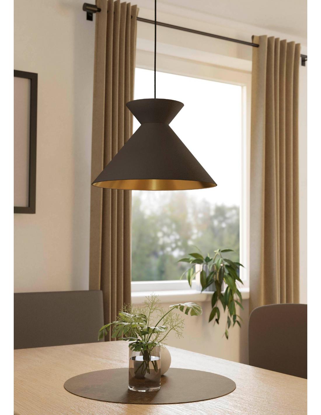 Very elegant hanging lamp with geometric tulip in gray steel with gold interior, matching its base made of steel in this same gold color. Perfect to place on a small dining table, it uses an E27 socket bulb, not included.