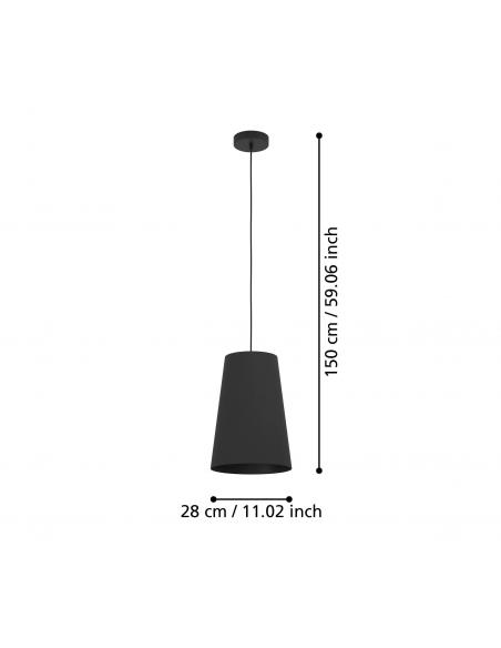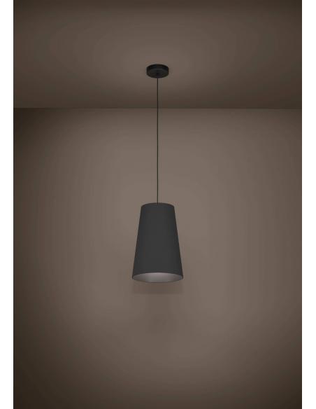 The PETROSA pendant lamp consists of a large conical shade made of black fabric and a black laminated interior. The black textile cable and the metallic canopy of the same color fit perfectly into the minimalist look of the lamp. The pendant lamp in monochromatic design especially complements the modern furniture and offers cozy lighting in the living room or dining room, above the table. The bulb is not included. The lamp is suitable for any bulb with an E27 socket.