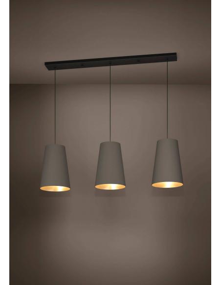 The PETROSA pendant lamp is made up of three large conical shades made of cappuccino-colored fabric and brass laminated interiors. The black textile cables and the metallic canopy of the same color fit perfectly into the minimalist look of the lamp. The pendant lamp in Retro-Chic style from the 60s especially completes modern furniture and offers cozy lighting in the living room or dining room, above the table. Bulbs are not included. The lamp is suitable for any bulb with an E27 socket.