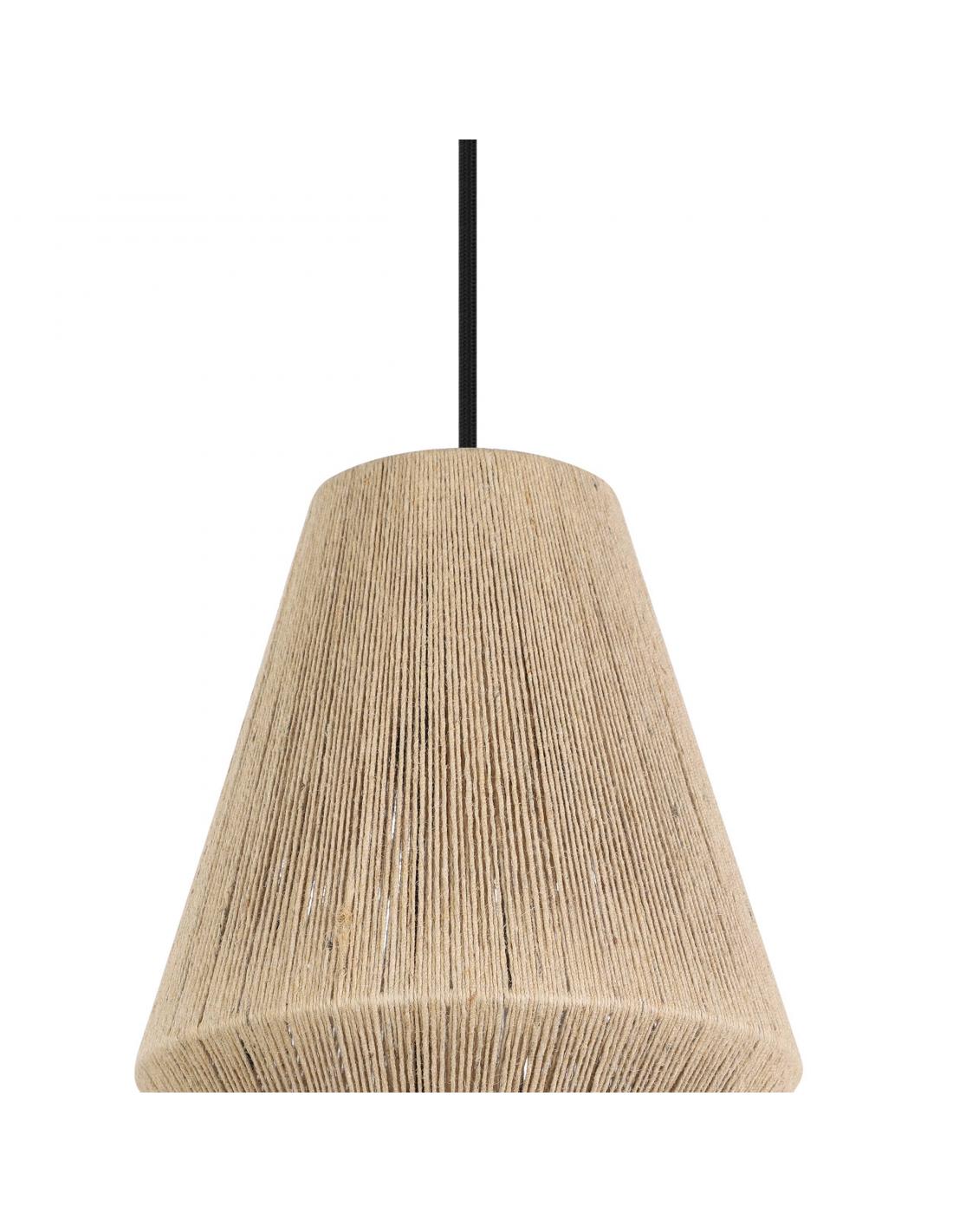 Three-light pendant lamp with tulips made of natural thread interwoven with a black steel structure, whose exotic result is perfect for natural, Nordic and rustic decorations. It is perfect for decorating your dining room on a long table and uses three e27 socket bulbs, not included.