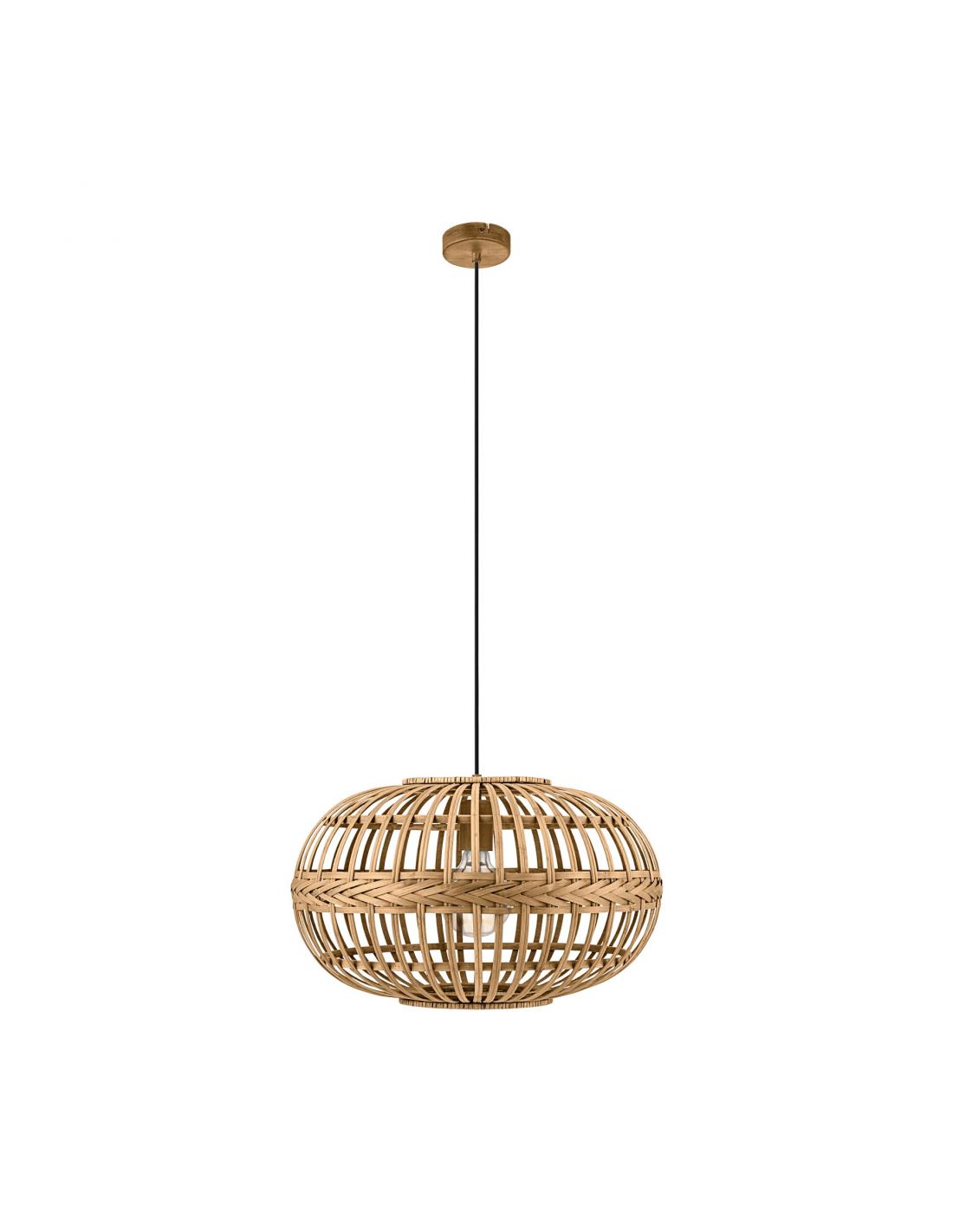 Natural style pendant lamp. Made of bamboo wood. Designed with a braided diameter of 38 centimeters and whose shade height is 26.5 cm. It uses an E27 bulb, not included.