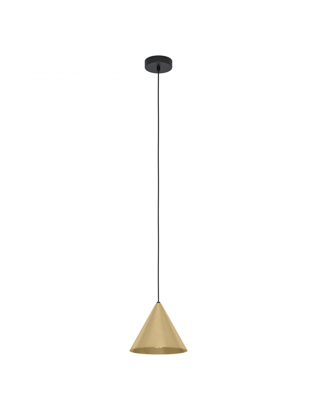 Pendant lamp with a golden steel cone suspended from a black height-adjustable cable on a black steel base. A simple but very elegant piece that will provide the final decorative touch that your room needs. It uses an E27 socket bulb, not included.