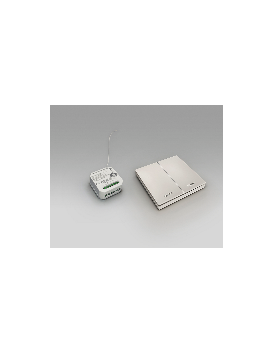 Dimming set: dimmer-receiver and wireless pushbutton. 200W. Functions: on, off and progressive dimming of the light. No battery or battery, powered by the kinetic energy of the pulsation.