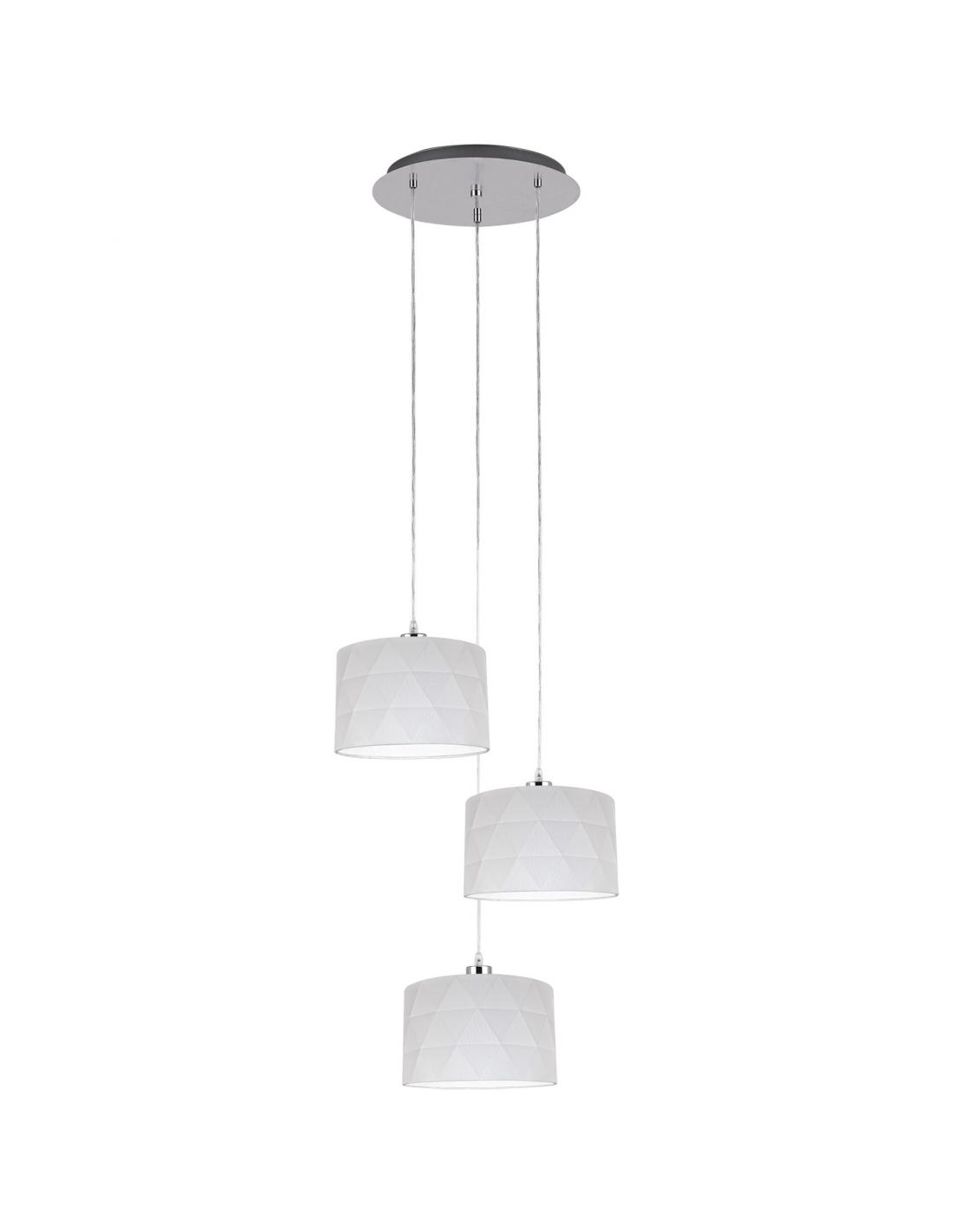 3X60W 220-240V,50/60Hz. It is characterized by the use of steel materials as the main part and textile for the screen. Combine colors such as Metallic in the lamp and White for the shade. Requires 3