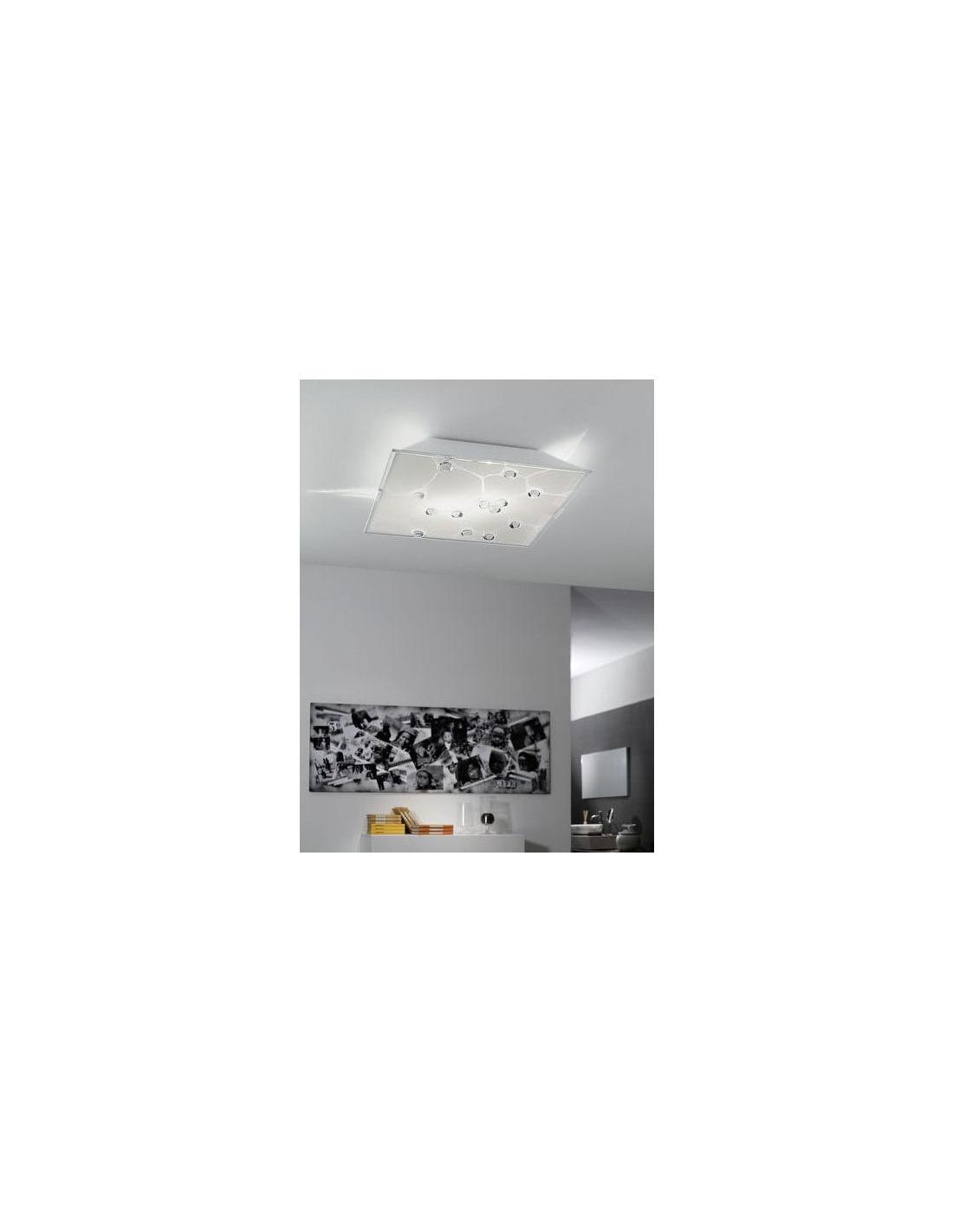 SABBIO 1 ceiling light made of glass with innovative design and white steel base for better support. A lamp that you can install in any room thanks to its width of 29 cm and height of 7.5 cm. Requires 2 E14 bulbs, NOT INCLUDED.