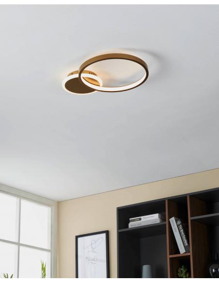 Golden LED ceiling lamp made with a square steel base and a circular aluminum head. This lamp can be operated by remote control, remote not included, and you can also control the temperature of its light so that it illuminates with a warm neutral light of 3000k up to a cold temperature of 6500k. A modern and functional ceiling lamp.