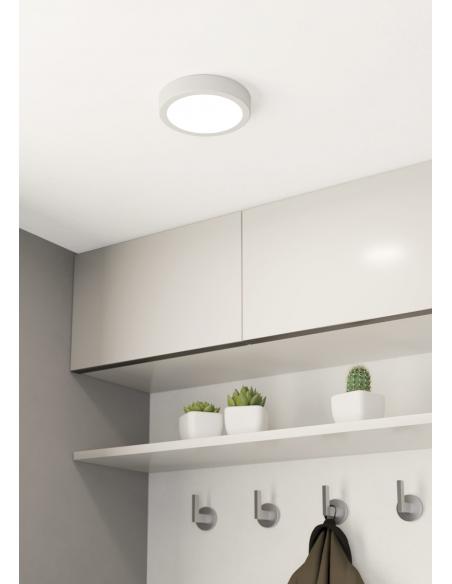Round LED ceiling light in white color made of steel with acrylic screen that prevents glare. It is a very functional ceiling light thanks to its 1350 lumens of power and its warm neutral light of 3000k, also perfect for bathrooms due to its IP44 protection. Switch to LED technology!