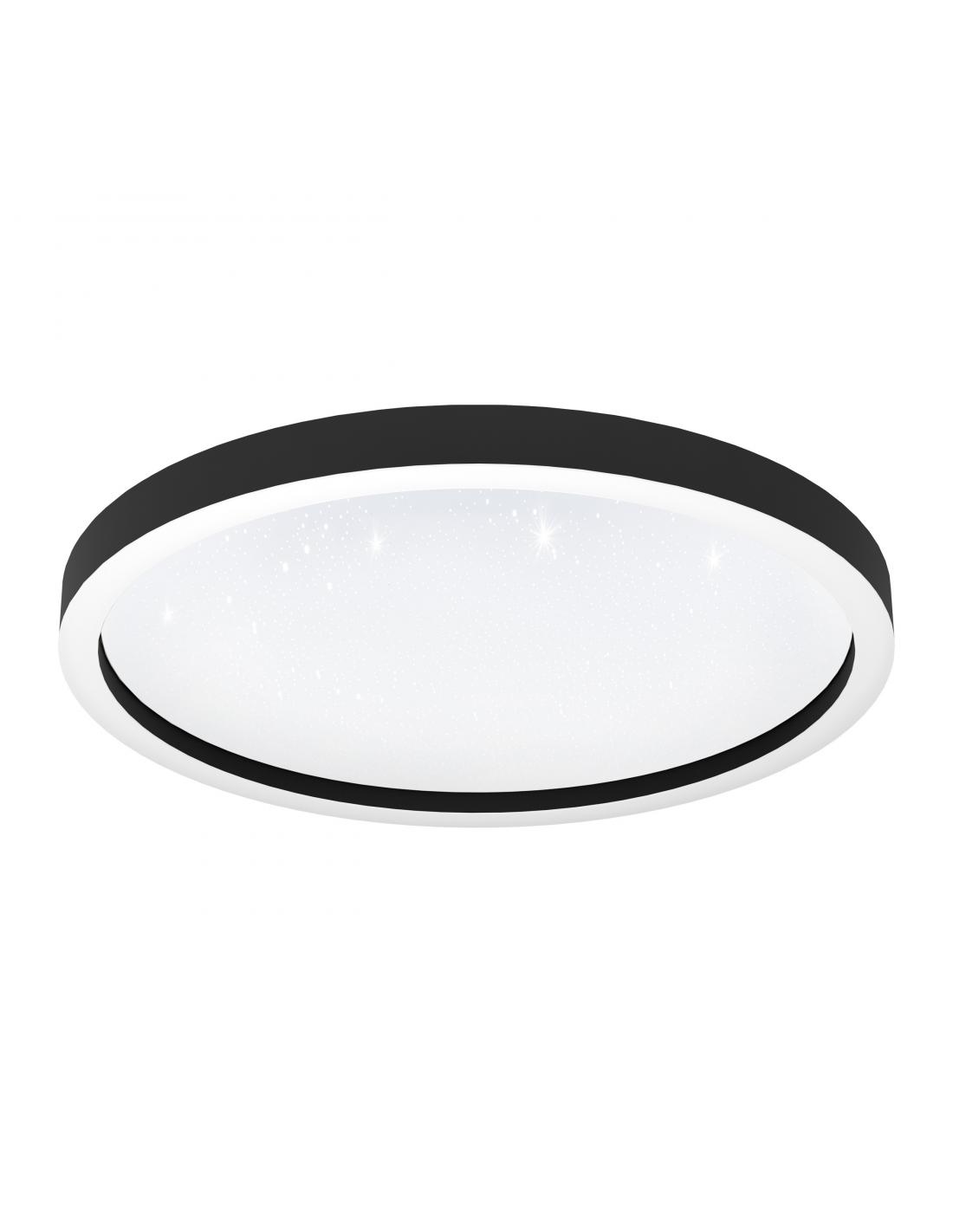 Round led ceiling light with black aluminum base and white trim on an acrylic screen with glass effect. This ceiling light is adjustable in terms of intensity and light temperature, from 2700 to 6500K, and you can control it remotely with a remote (not included) or free app. Also choose to change the color of its light if you prefer. It has 34.5W of power and 4100 lumens. Long live the smart home!