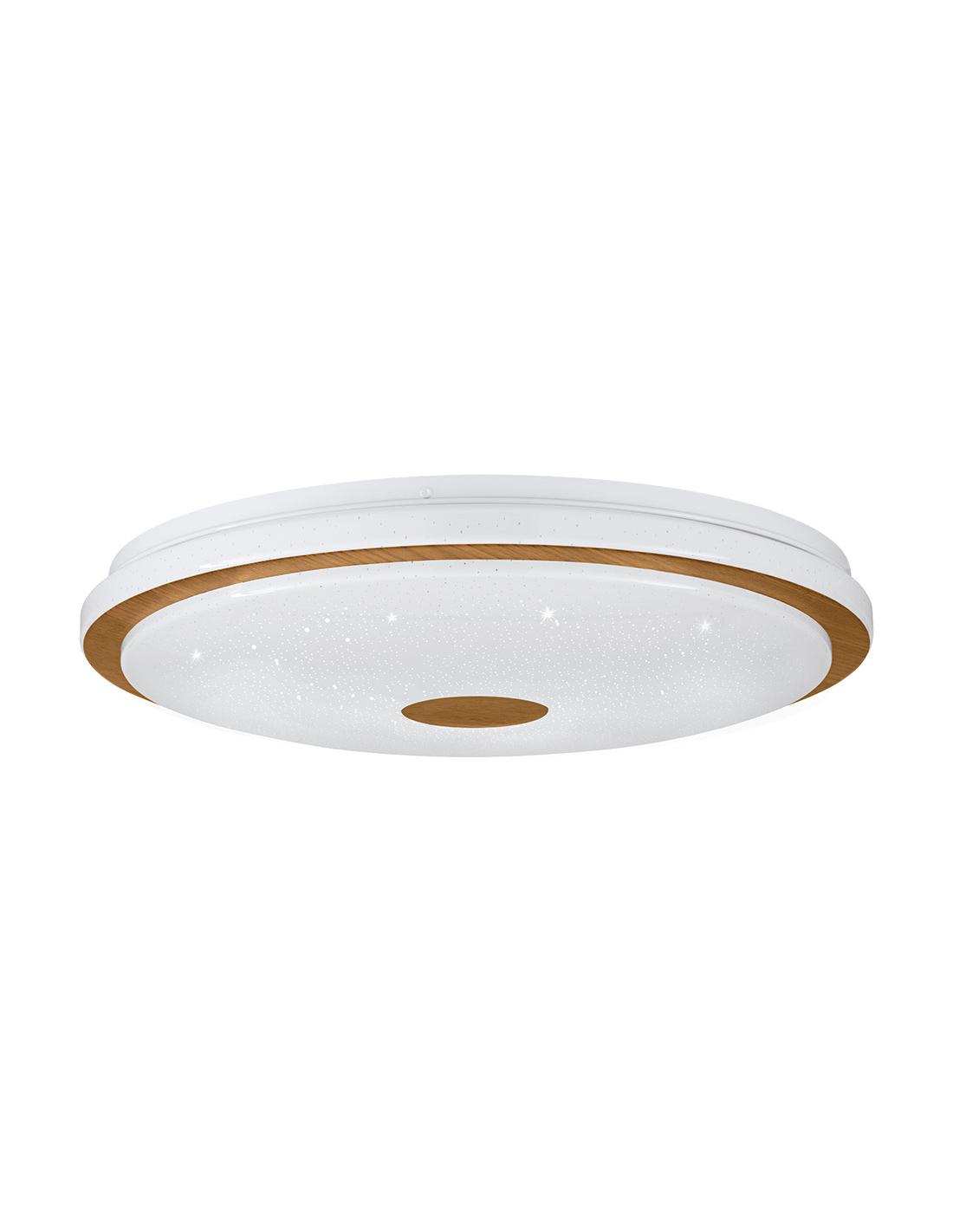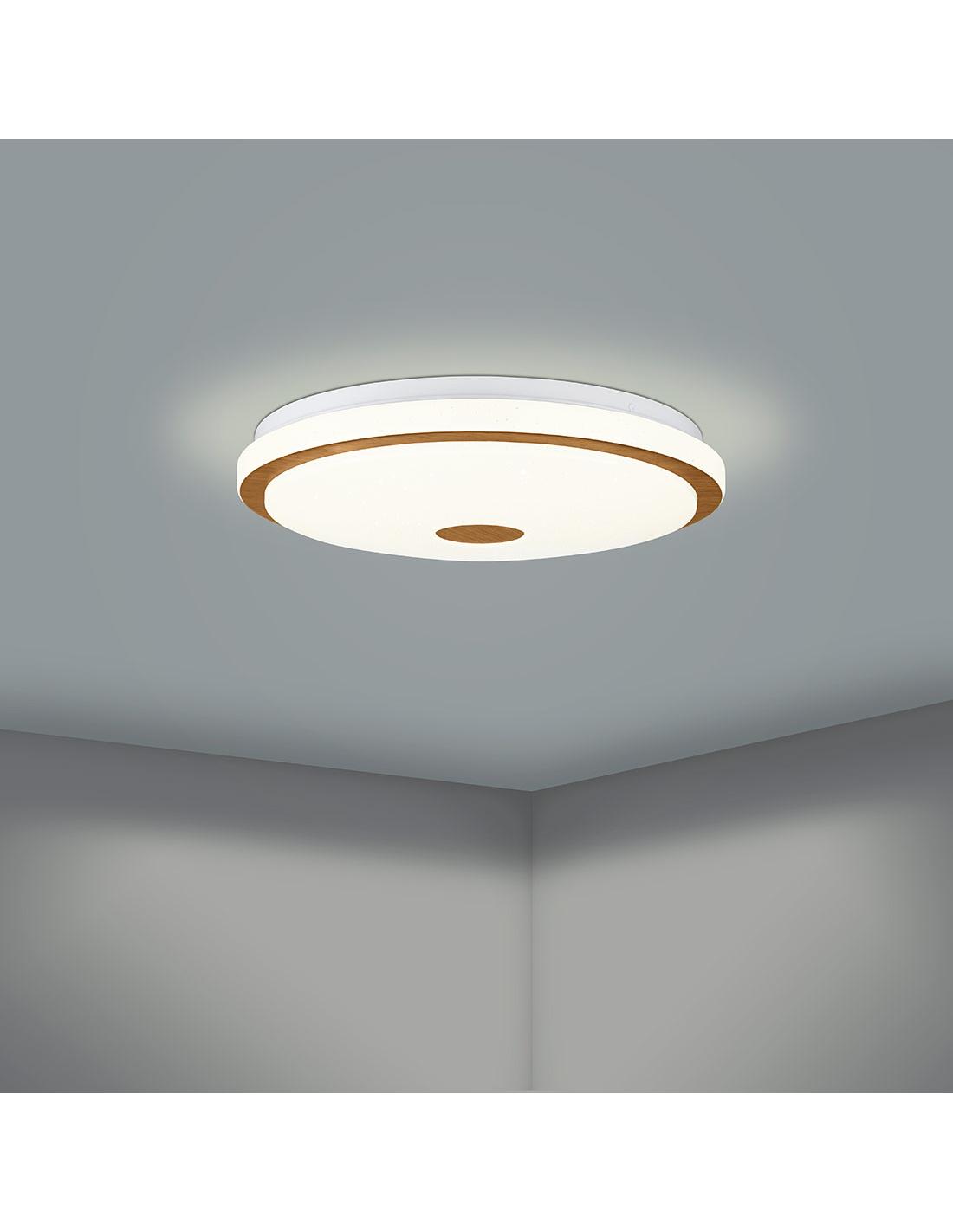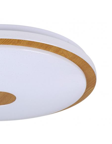 Ceiling light with built-in led in white with a decorative wooden strip and circle and starry effect on its acrylic screen. Includes remote control for its control with which you can turn it on and off, control its intensity and its light temperature in 3 comfortable jumps of 3000k, 4000k and 5000k. Available in 2 sizes, this one is larger, 48 cm and has an analogous model of 38 cm depending on the size of your room.