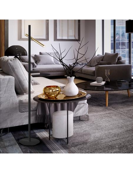 2-light LED floor lamp. Made of metal finished in shiny gold and matte black. Opal acrylic diffuser.10W LED, 900 lm, 3,000 K.