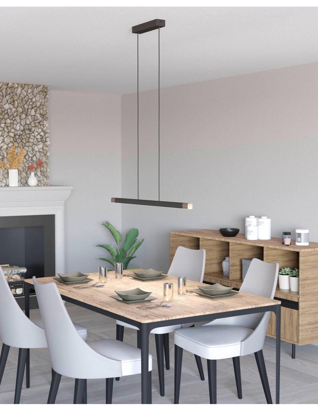 The LISCIANA LED pendant lamp is made up of a dark brown suspended aluminum profile and walnut-look rubber wood plugs. The black textile cable and the metallic canopy of the same color perfectly complete the modern look of the lamp. The integrated LEDs that emit a pleasant warm white light placed behind the matt white plastic light surface can be dimmed by means of a dimmer. With a length of 87.5 cm, the linear design pendant lamp offers suitable lighting for the dining room, above the table.