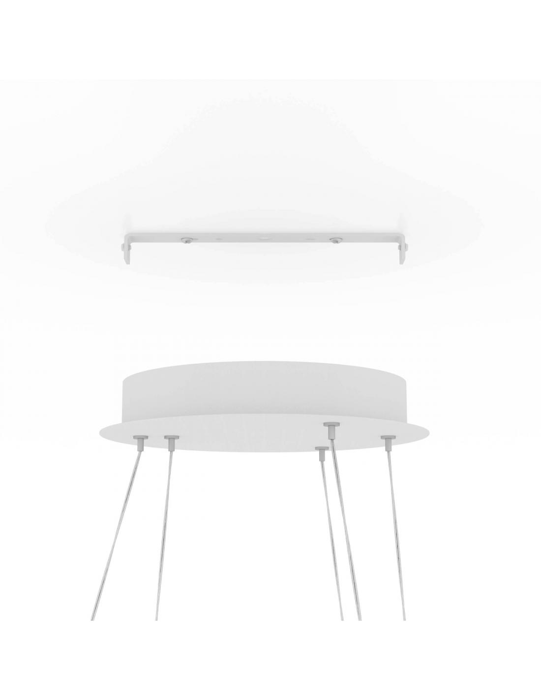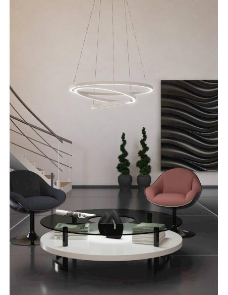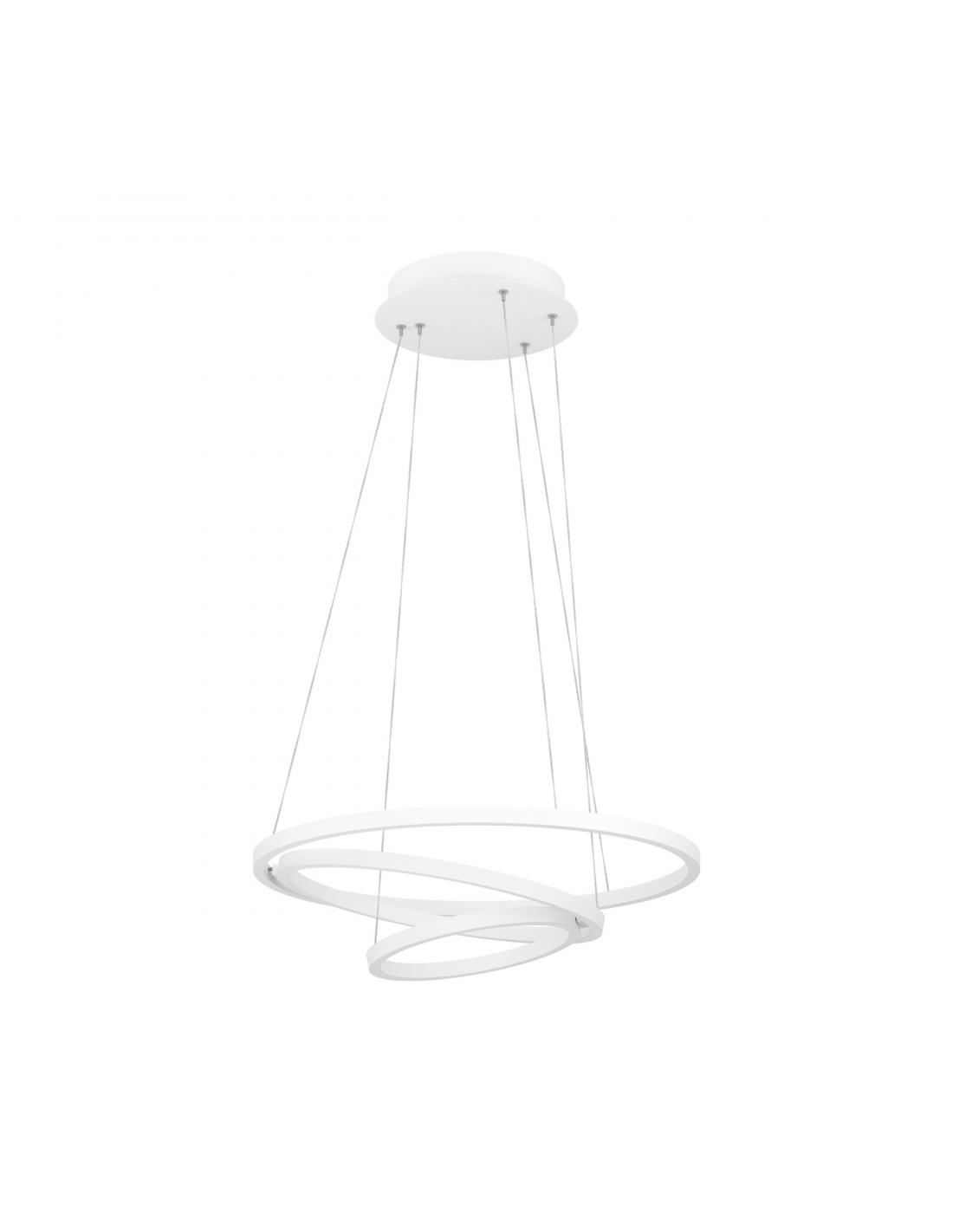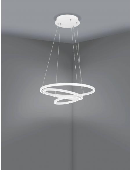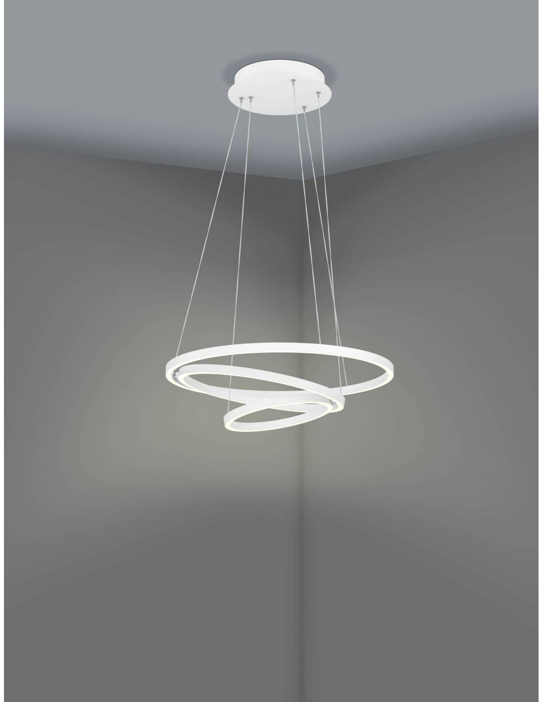 Minimalist white and smart led pendant lamp with programmable functions, remote control via free app or remote (not included) and regulation through these functions of the temperature of your light (from 3000k warm neutral to 6500k cold) in addition to regulation of the intensity of your light. Ideal for any environment, especially the living room. This lamp is designed with interlocking circles made of white aluminum suspended from wiring, installed on a white steel base. Integrated LED.