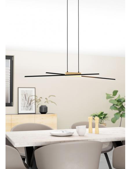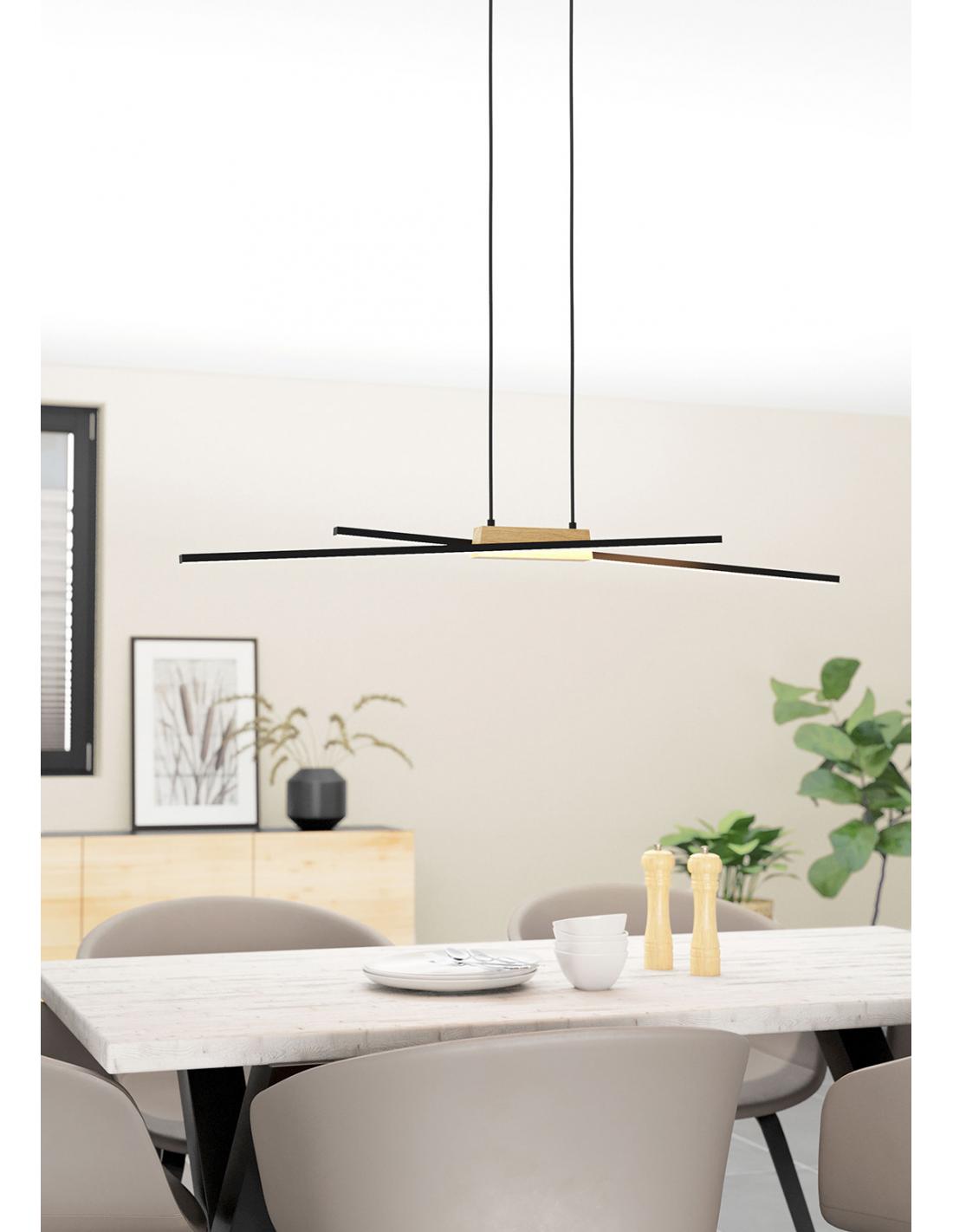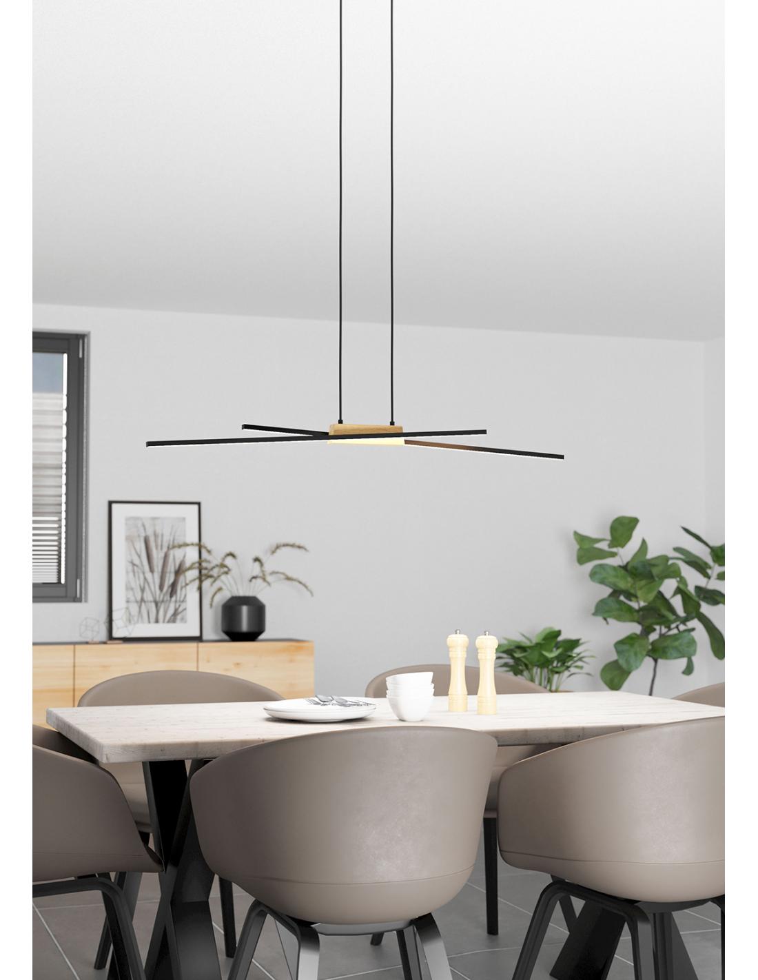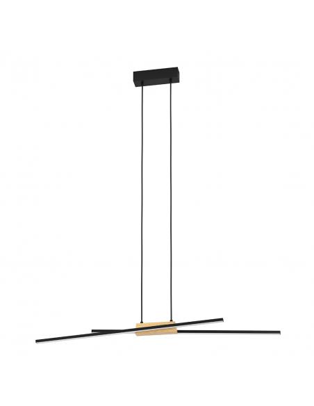 Minimalist led pendant lamp with two luminaires for more powerful lighting. Specifically, this pendant lamp has 3120 lumens and emits a warm white light of 3000K. It is adjustable in light intensity and is made of black aluminum with wooden lamp holder, black steel base and adjustable height wiring in the same color.