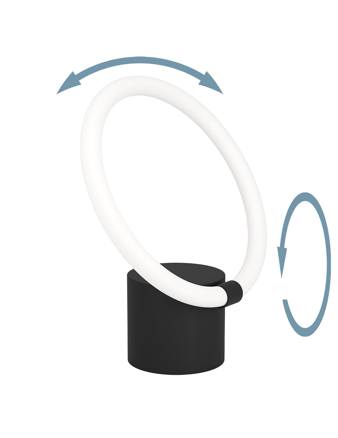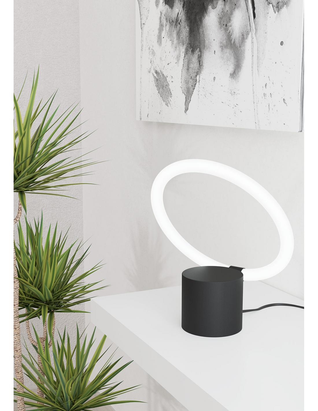 Minimalist led table lamp with black steel base and white acrylic luminaire with integrated led. It is operated with a cable switch, has 1500 lumens of power and its light color is warm neutral, 3000k. A different, original lamp that will also help you decorate your room.