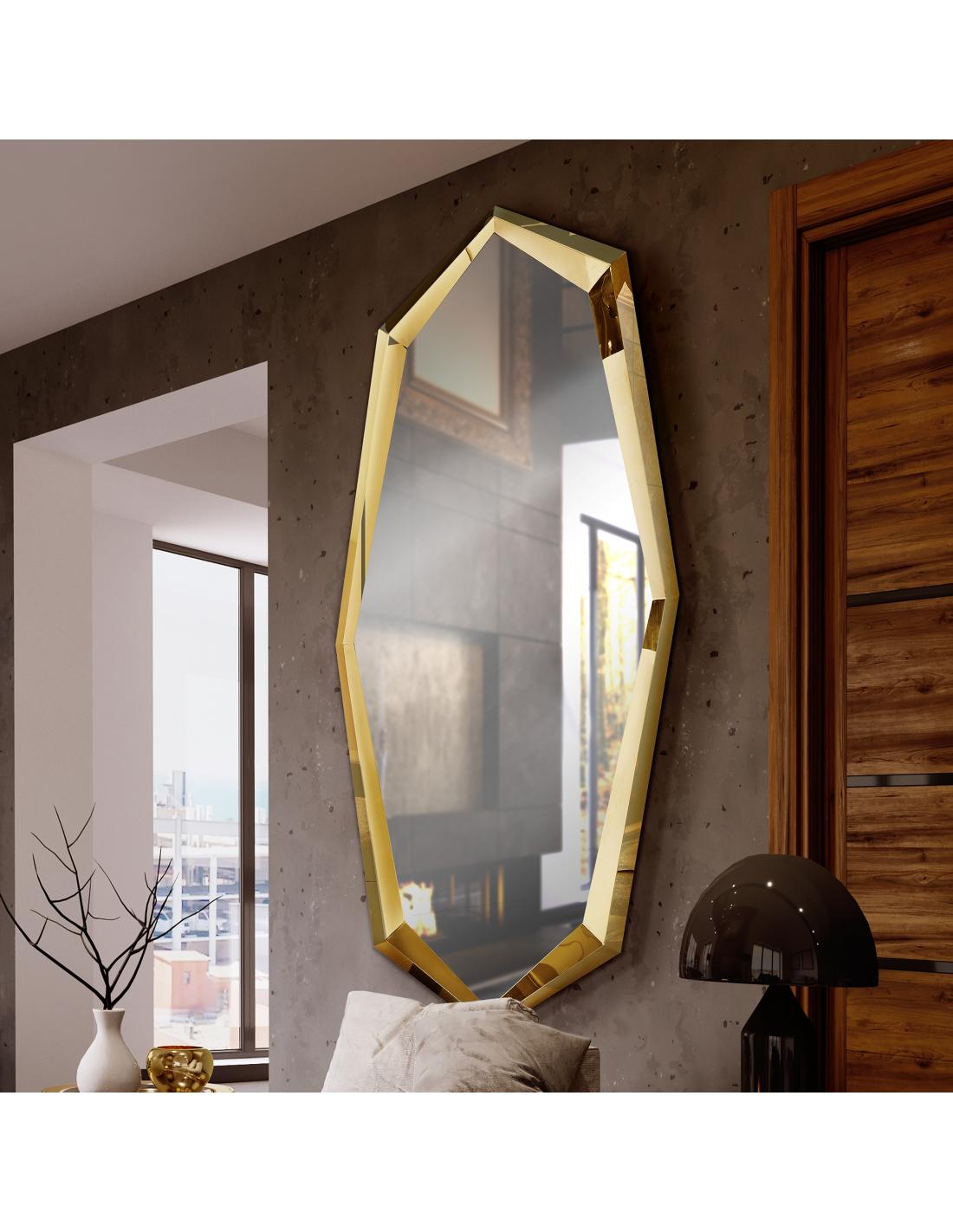 Mirror with polyhedral frame of high gloss polished steel, gold finish. Central moon. Prepared to hang horizontally and vertically.