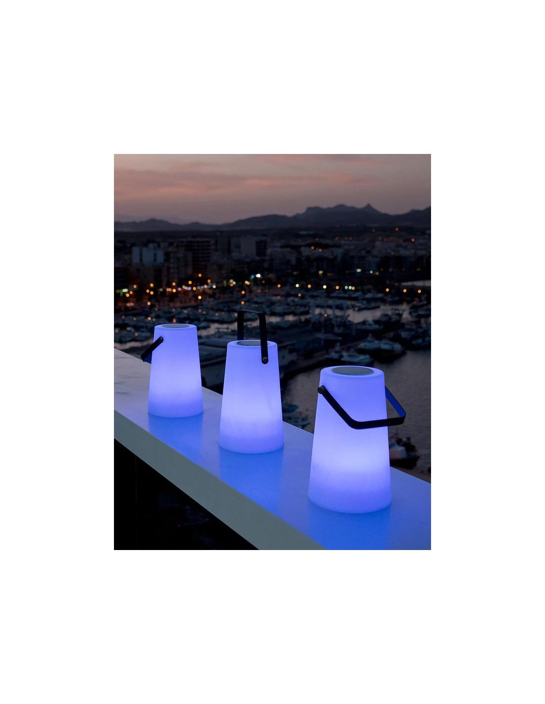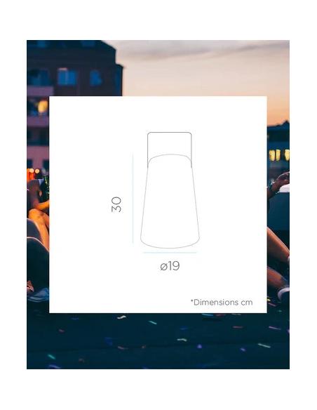 Nómada is a portable cone-shaped lamp, its size and lightness stand out considerably from this product. Handy and versatile, it will become an indispensable part of your home. Take it wherever you want The PLAY finish mixes music and light so you can enjoy hours and hours of your favorite songs. SIZE ø19 x 30 cm Technical characteristics finish RECHARGEABLE BATTERY WITH MUSIC AND LIGHT OUTDOOR AND INDOOR USE LIGHT INCLUDED YES RGB LED LIGHT COLOR WHITE LUMENS 45 INTEGRATED LED SOCKET SOLAR CHARGE NO SOLAR CHARGING AUTONOMY - ELECTRIC CHARGING RECHARGEABLE BATTERY WITH CHARGER YES 5V ELECTRIC CHARGING AUTONOMY 8-12H Nº OF SPEAKERS 1 SPEAKER POWER 5W BLUETOOTH TECHNOLOGY REMOTE INCLUDED YES CHARGER INCLUDED YES IP IP54 PROTECTION INDEX, INDOOR AND OUTDOOR USE For more information download the complete technical sheet TECHNICAL DATA SHEET INSTRUCTION MANUAL BACK TO TOP
