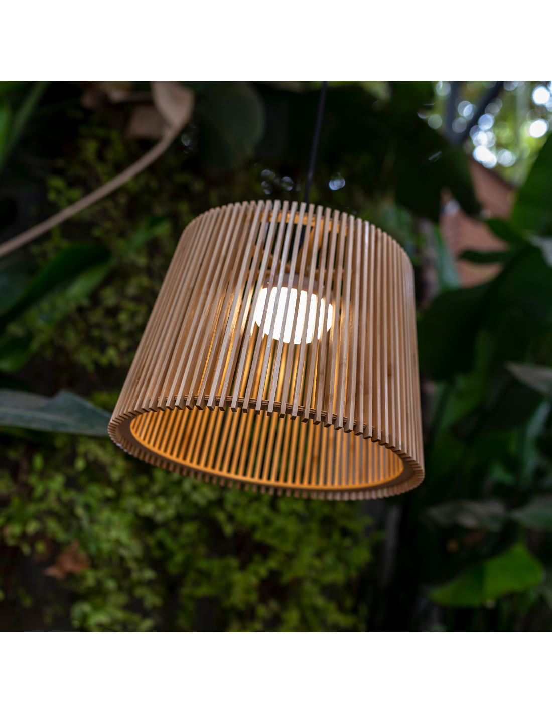 The Okinawa 40 Hang outdoor pendant lamp is handmade with Bamboo. Its organic design and flared shape with straight lines make it an indispensable product for any terrace or garden. It can be combined with other products from the Okinawa series such as the garland, the Okinawa Lantern or the outstanding Okinawa 170 floor lamp. All of them form a set of lamps that bring a touch of harmonious nature to your home. The Okinawa 40 Hang outdoor pendant lamp includes 3 meter rope, shade and the portable rechargeable Cherry bulb. This bulb does not require installation, you just have to bring it close to the metal area of the shade and it will adhere due to its magnetic base. This bulb also includes a remote control to be able to turn on and off and regulate its intensity. It has 900 lumens and an autonomy between 6 and 20 hours depending on its intensity. SIZE ø39 x 28 cm Technical characteristics finish RECHARGEABLE BATTERY OUTDOOR AND INDOOR USE LIGHT INCLUDED YES LIGHT COLOR 3000ºK WARM WHITE LUMENS 900LM INTEGRATED LED SOCKET SOLAR CHARGE NO SOLAR CHARGING AUTONOMY - ELECTRIC CHARGING RECHARGEABLE BATTERY WITH CHARGER YES 5V ELECTRIC CHARGING AUTONOMY UP TO 20H REMOTE INCLUDED YES CHARGER INCLUDED INCLUDES USB CHARGING CABLE - MICRO USB TWILIGHT SENSOR NO IP IP54 PROTECTION INDEX, INDOOR AND OUTDOOR USE For more information download the complete technical sheet TECHNICAL SHEET INSTRUCTION MANUAL BACK TO TOPIr top
