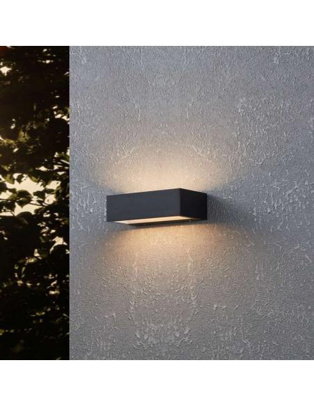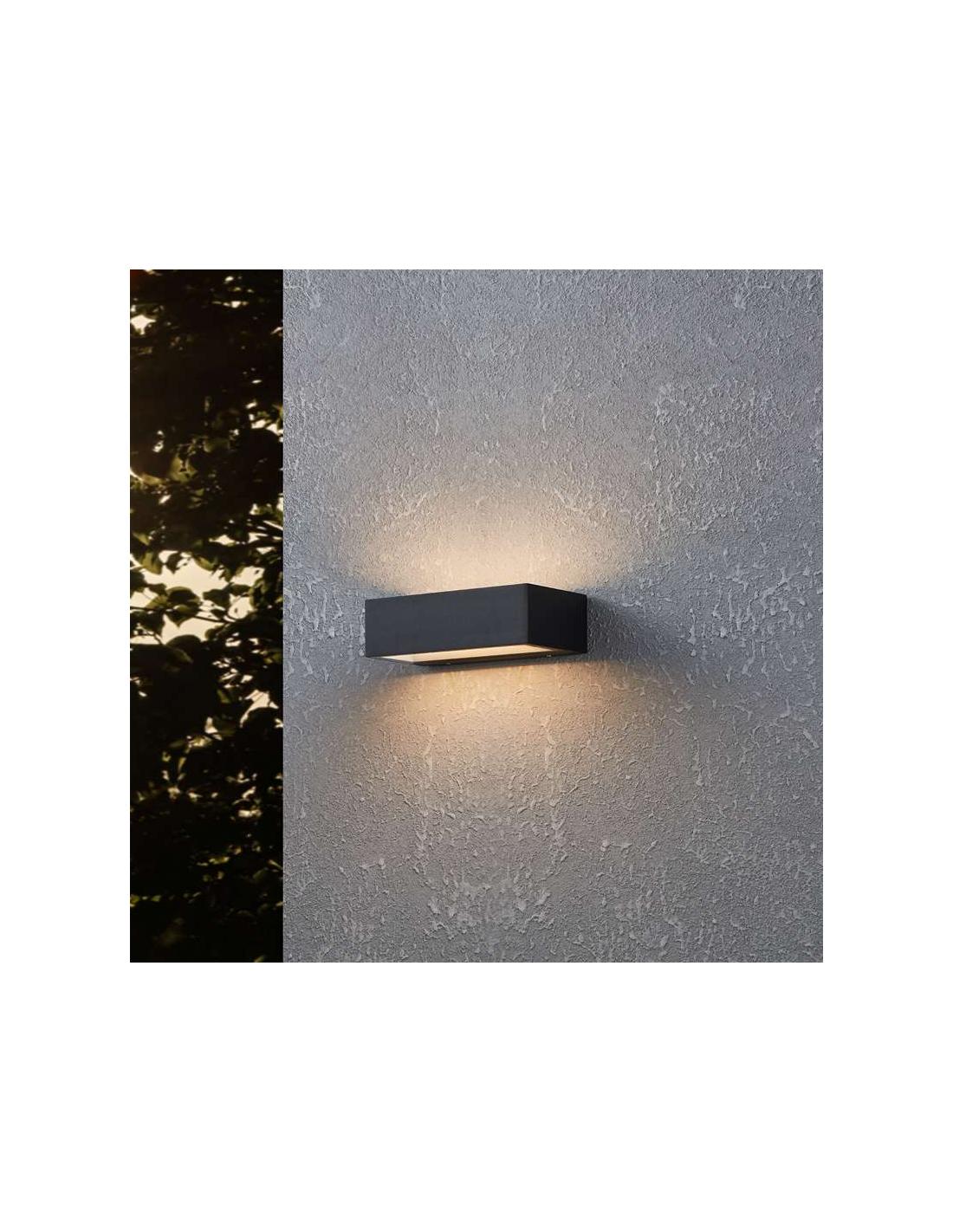 The wall lamp is resistant to dust and water jets (IP65) and allows safe outdoor use.