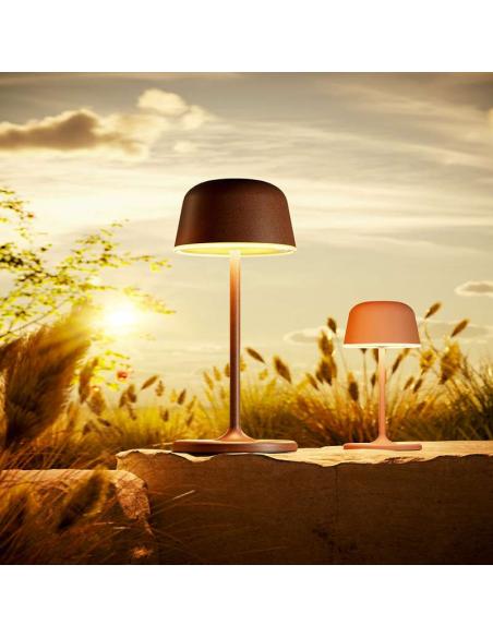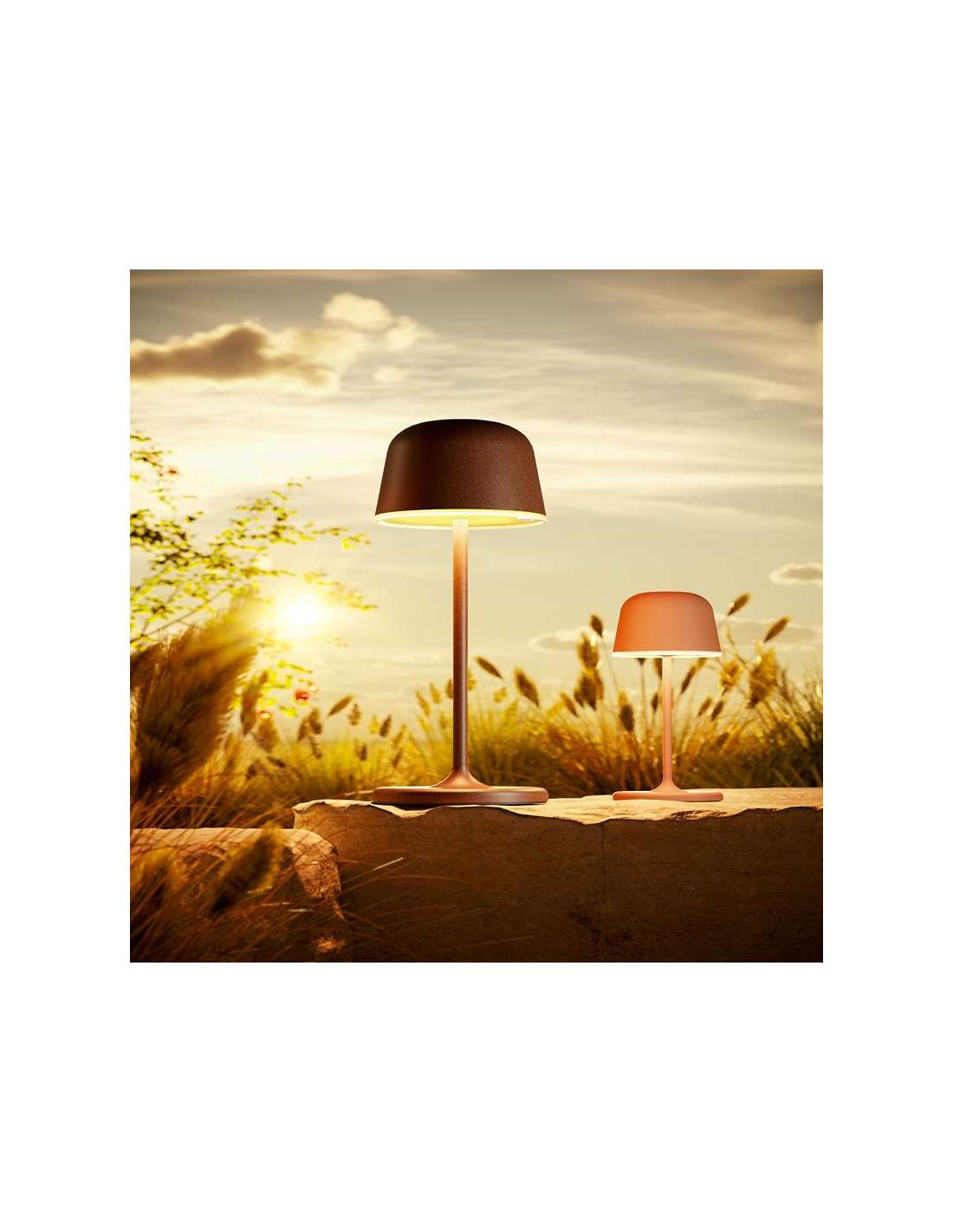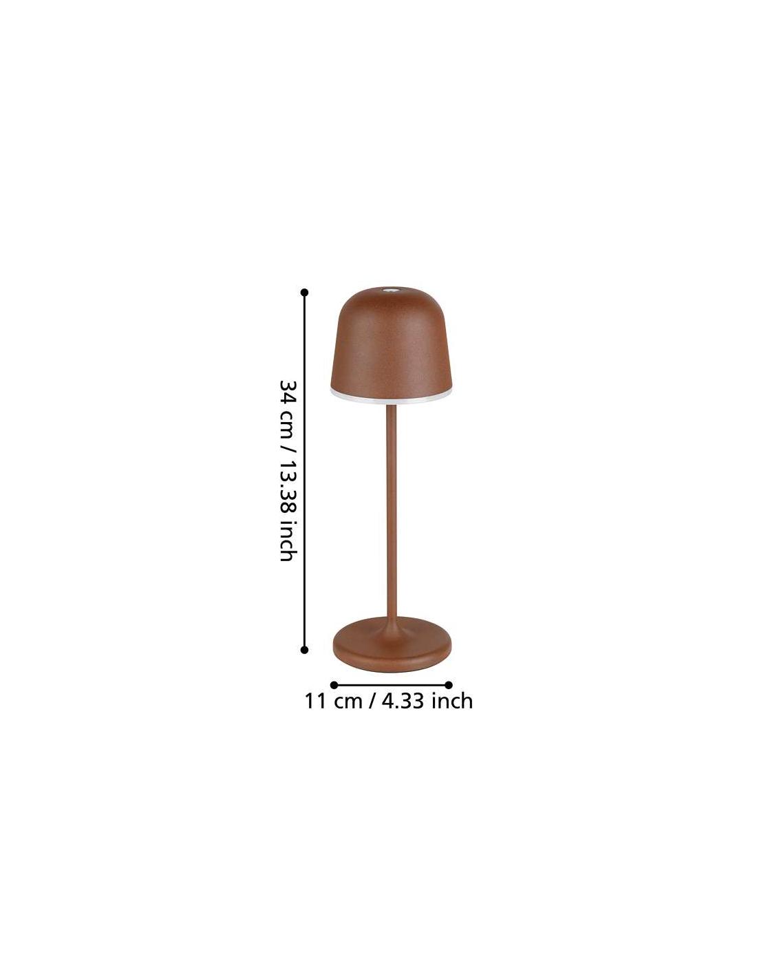 The MANNERA table lamp is made of brown aluminum, combined with a white plastic surface. The integrated LEDs provide a white, warm and pleasant light. Thanks to its "touch-yo" touch system, integrated into the lampshade, the light can be turned on, off and dimmed. The built-in battery allows for practical and hassle-free lighting wherever you want and can be recharged with the help of a USB-C cable (not included). Thanks to its IP54, this lamp has a protection system against dust and water, allowing its use outdoors. Thanks to the timeless and homely design, it fits every modern style area, whether on the terrace, balcony, or inside the house.