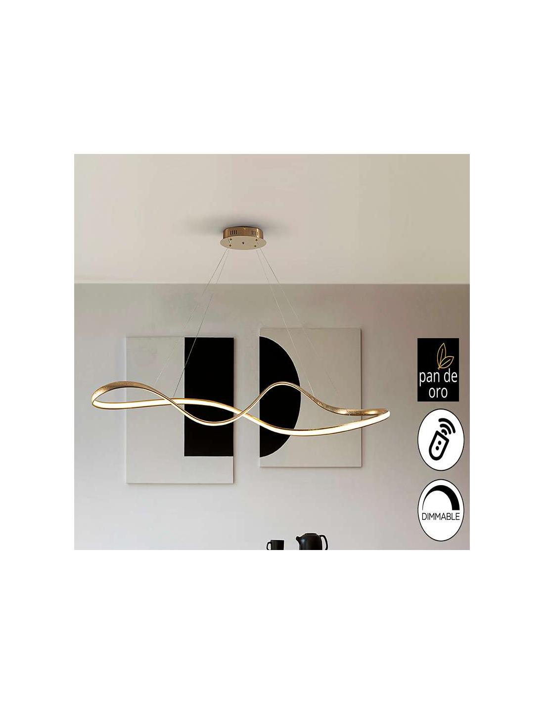Lamp with LED light, DIMMING and CCT color change. Made of steel and aluminum, GOLD LEAF finish and details in shiny gold plating. Opal silicone diffuser. Adjustable in height. LED lighting 37W, 2800 lm, 2700-5000 K. Includes remote control.