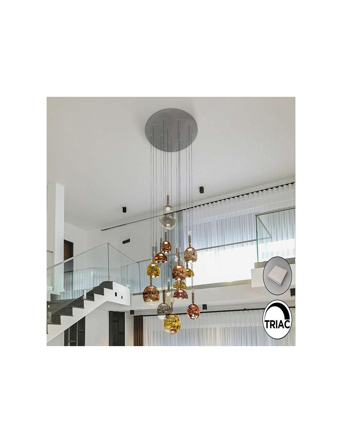 16-light lamp, made of brushed aluminum finished in dark gray tone. Mirrored glass tulips with electrolytic bath in copper, gold, silver and transparent glass tones, with LED light and opal acrylic diffuser. 96W LED, 3,520 lm, 3000