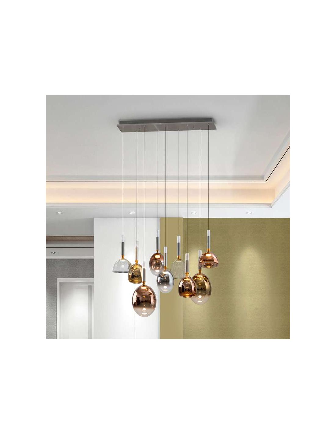 9-light lamp, made of brushed aluminum finished in dark gray tone. Mirrored glass tulips with electrolytic bath in tones: copper, gold, silver and transparent glass, with LED light and opal acrylic diffuser. 54W LED, 1,980 lm, 3000