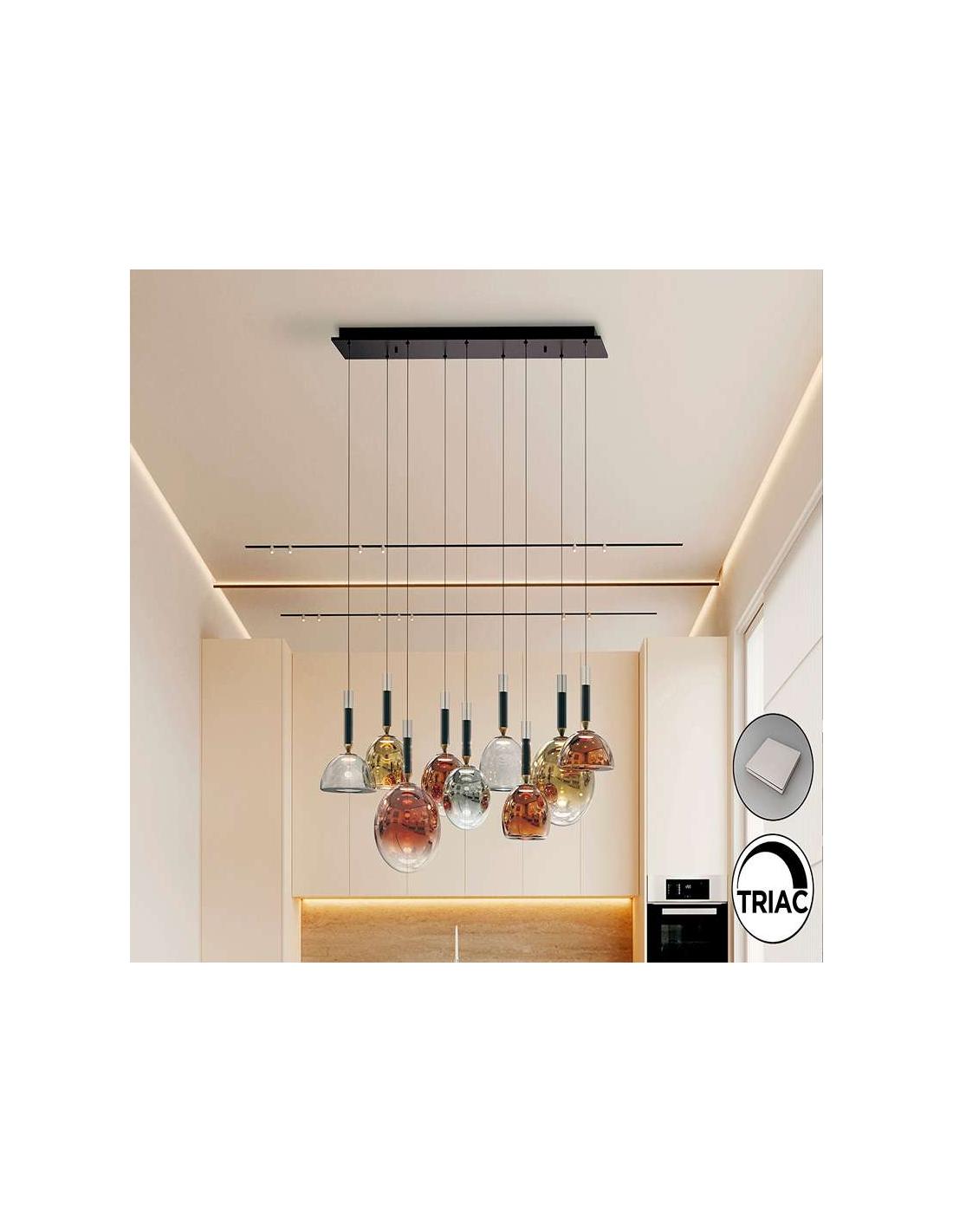 9-light lamp, made of brushed aluminum finished in dark bronze tone. Mirrored glass tulips with electrolytic bath in tones: copper, gold, silver and transparent glass, with LED light and opal acrylic diffuser. 54W LED, 1,980 lm, 30