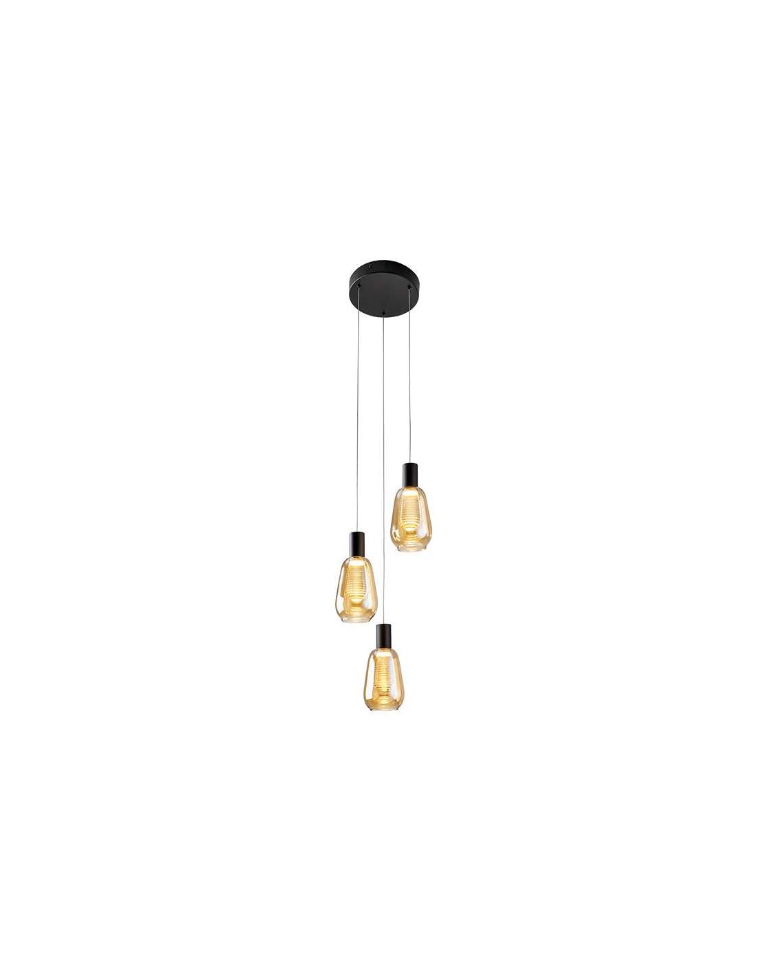 3-light lamp, made of matte black finished metal. Double shade, exterior made of amber glass and interior diffuser in transparent polycarbonate with stepped stripes. Adjustable in height. 15W LED, 1,050 lm, 3,000K.