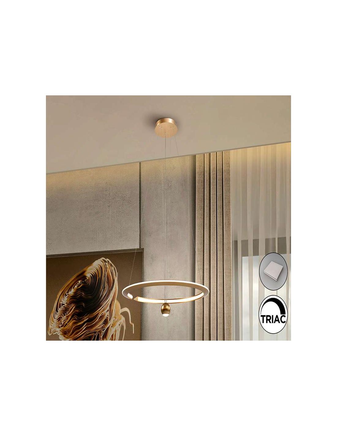 Lamp in steel and brushed aluminum, finished in anodic gold. Opal silicone diffuser. Allows you to adjust the height manually by pulling the central ball. DIMMABLE, 46W LED, 3400lm, 3000K Includes TRIAC driver and DIMMED SET.