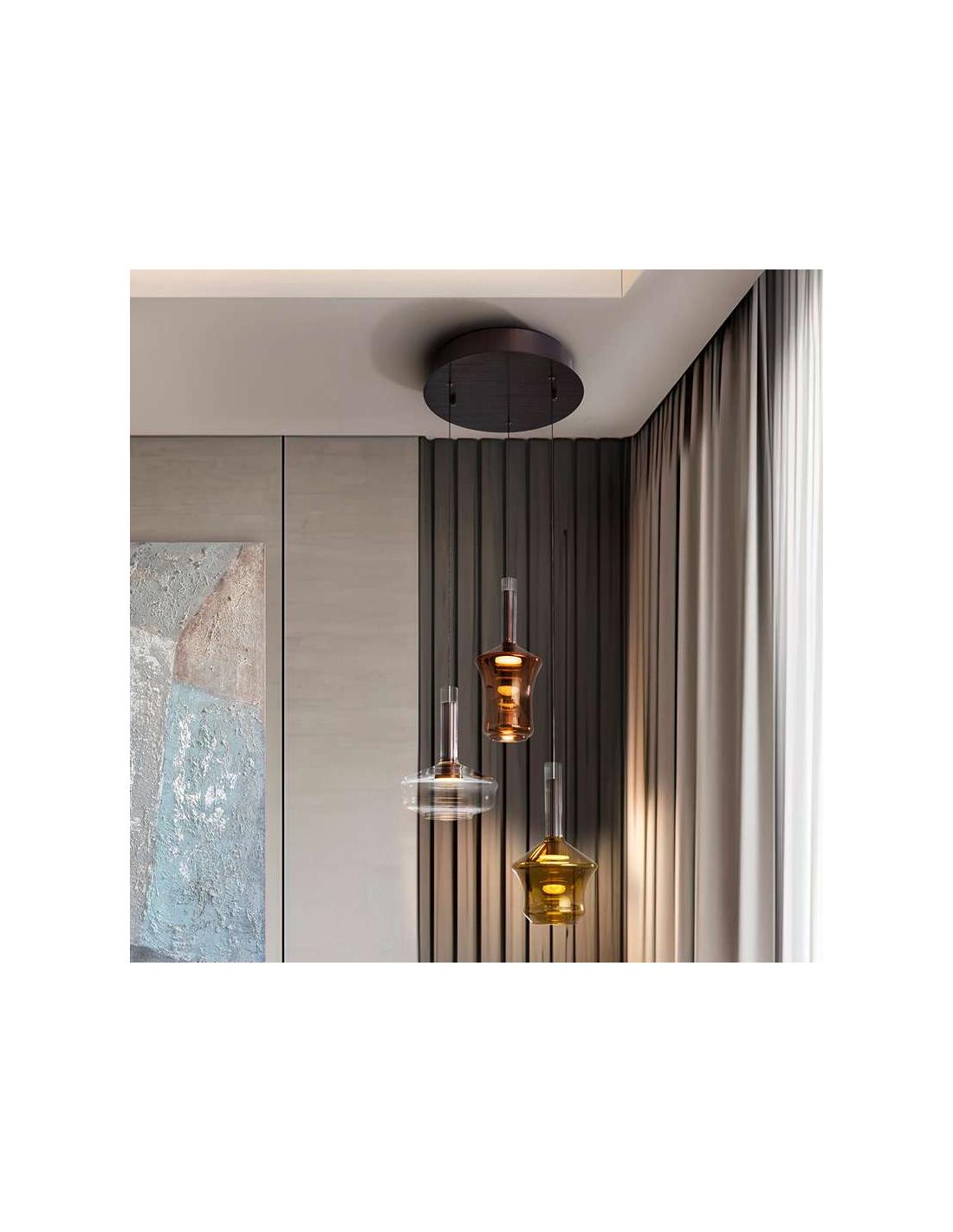 3-light lamp, made of brushed aluminum finished in dark bronze tone. Mirrored glass tulips with electrolytic bath in copper, gold and transparent glass tones, with LED light and opal acrylic diffuser. 18W LED, 570 lm, 3000K