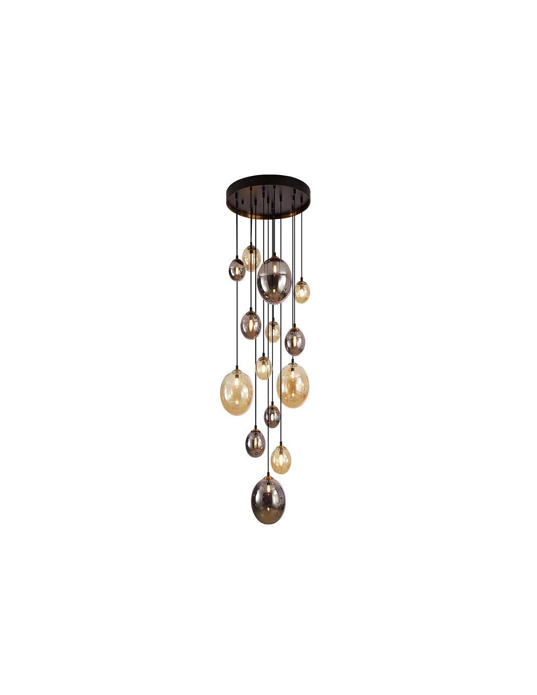 14-light lamp made of matte black finished metal, with satin brass details. Spherical glass tulips of 10, 12 and 20 cm, in amber and mirrored smoke gray finishes. Adjustable in height up to 500cm