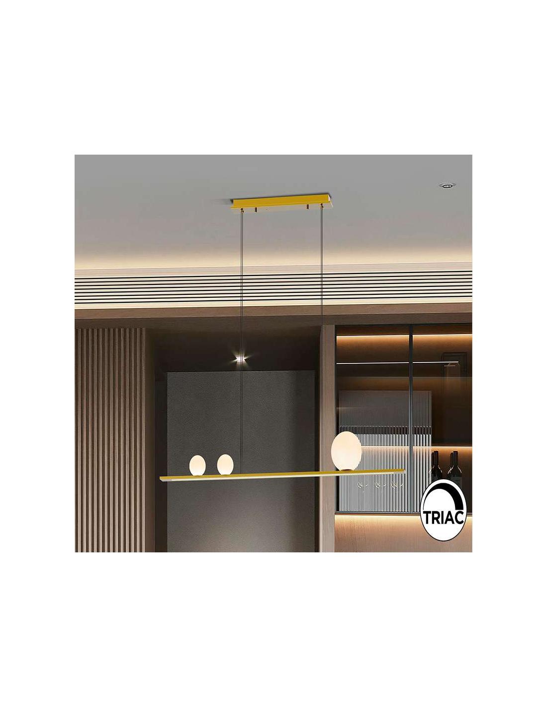 Lamp made of epilated aluminum, gold finish. 3 spherical shades of white tinted glass and lower diffuser in opal acrylic. 31W LED, 1,204 lm, 3000K.