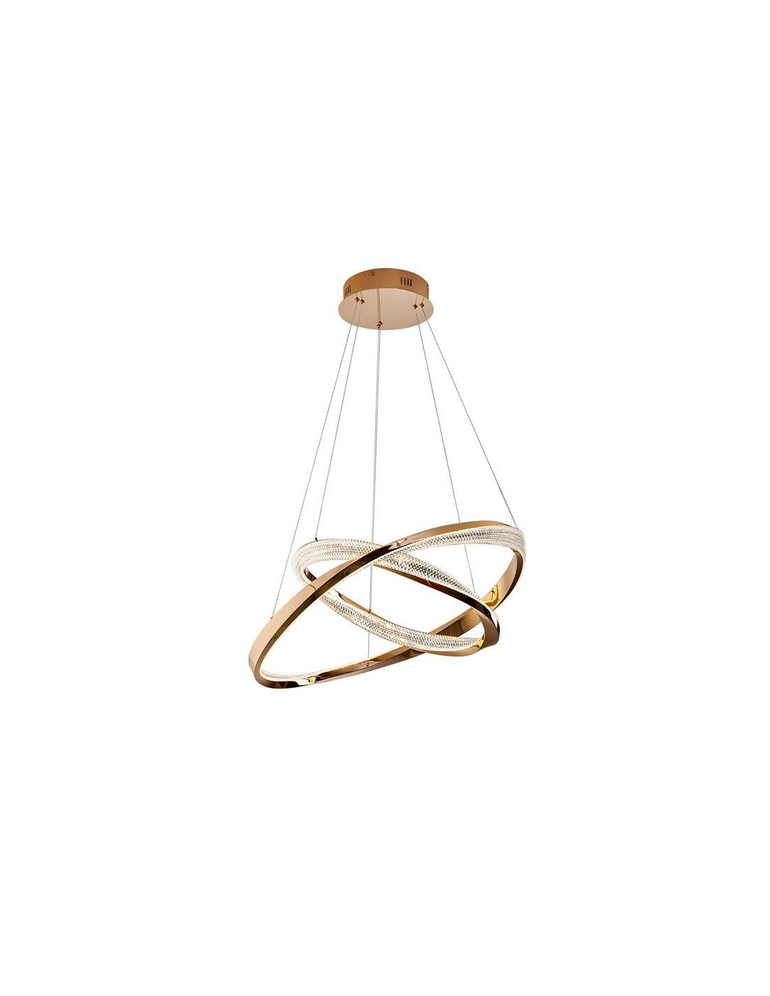 2-ring lamp (Ø60 and Ø80cm), made of steel and aluminum, shiny gold plated finish. Transparent faceted acrylic diffuser. Adjustable in height. 68W LED, 4,700 lm, 3,000K. Dimmable. Includes TRIAC driver and dimming SET.