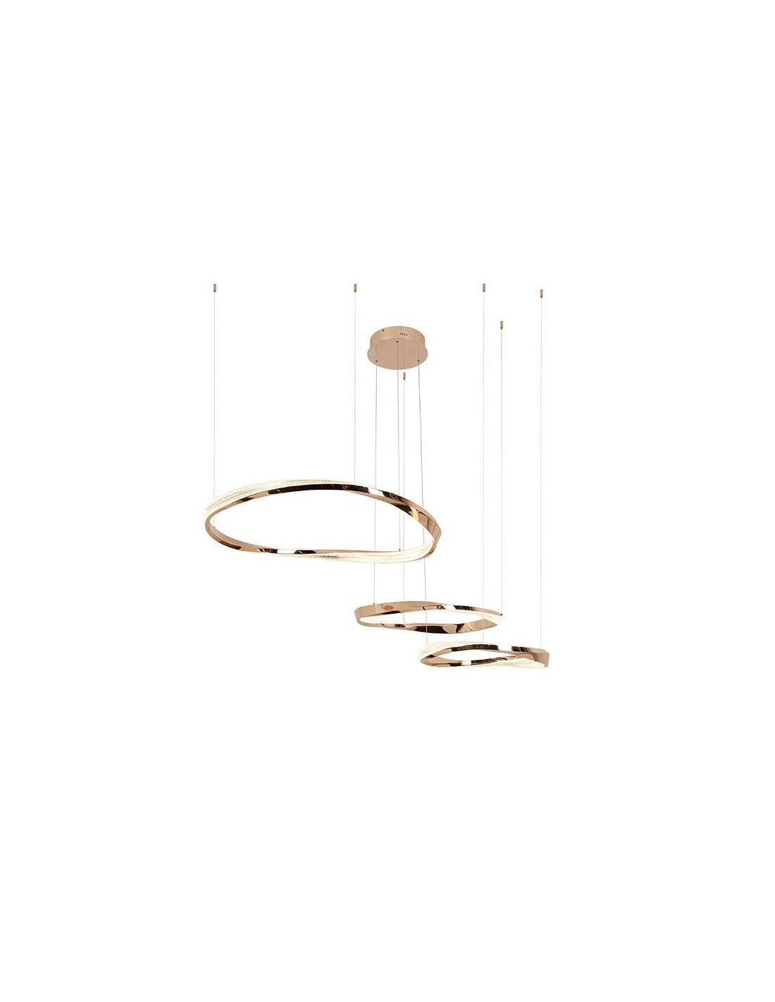 3-ring lamp (Ø55, Ø70, Ø85 cm), made of steel and aluminum, shiny gold plated finish. Transparent faceted acrylic diffuser. Adjustable in height. 120W LED, 8,400 lm, 3,000K. Dimmable. Includes TRIAC driver and dimming SET.