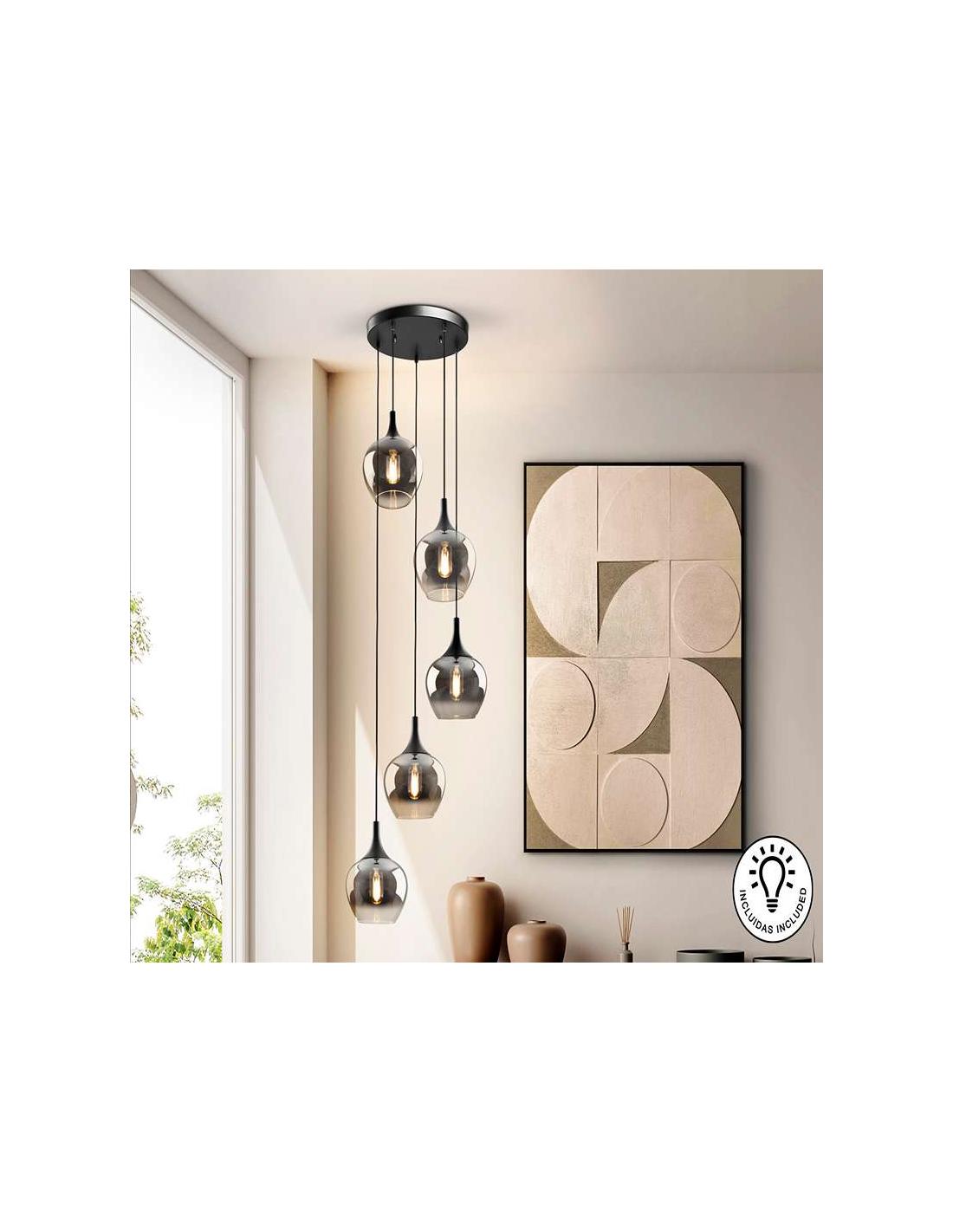 5-light lamp, made of matte black finished metal. Tulip Ø19 cm of molded smoke gradient glass. Adjustable in height.