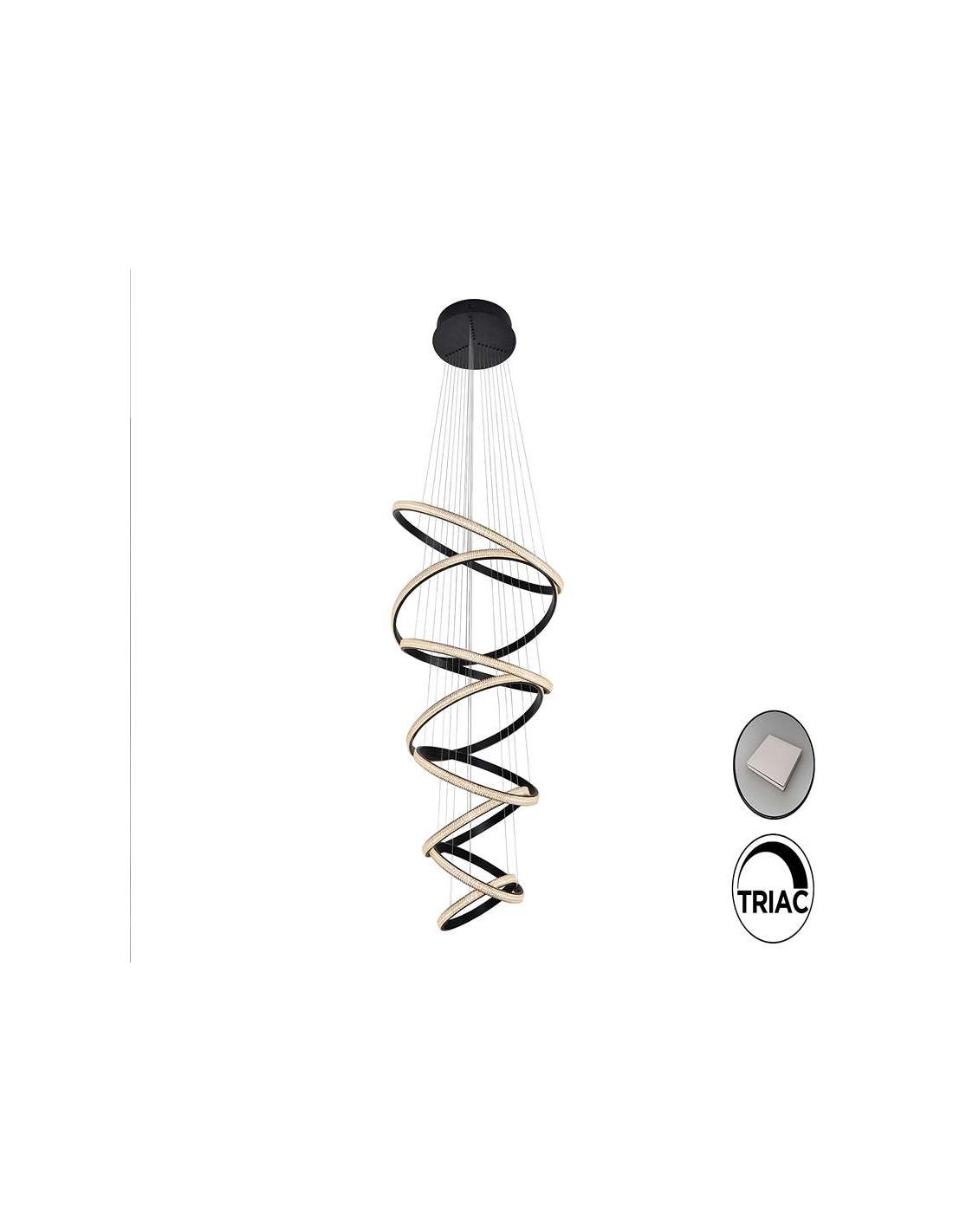 Lamp in metal and aluminum finished matte black sandblasted. Eight rings, adjustable in height, with diffuser of transparent acrylic pieces. 162W LED. 8,100 lm. 3,000 K. Includes TRIAC driver and DIMMED SET.