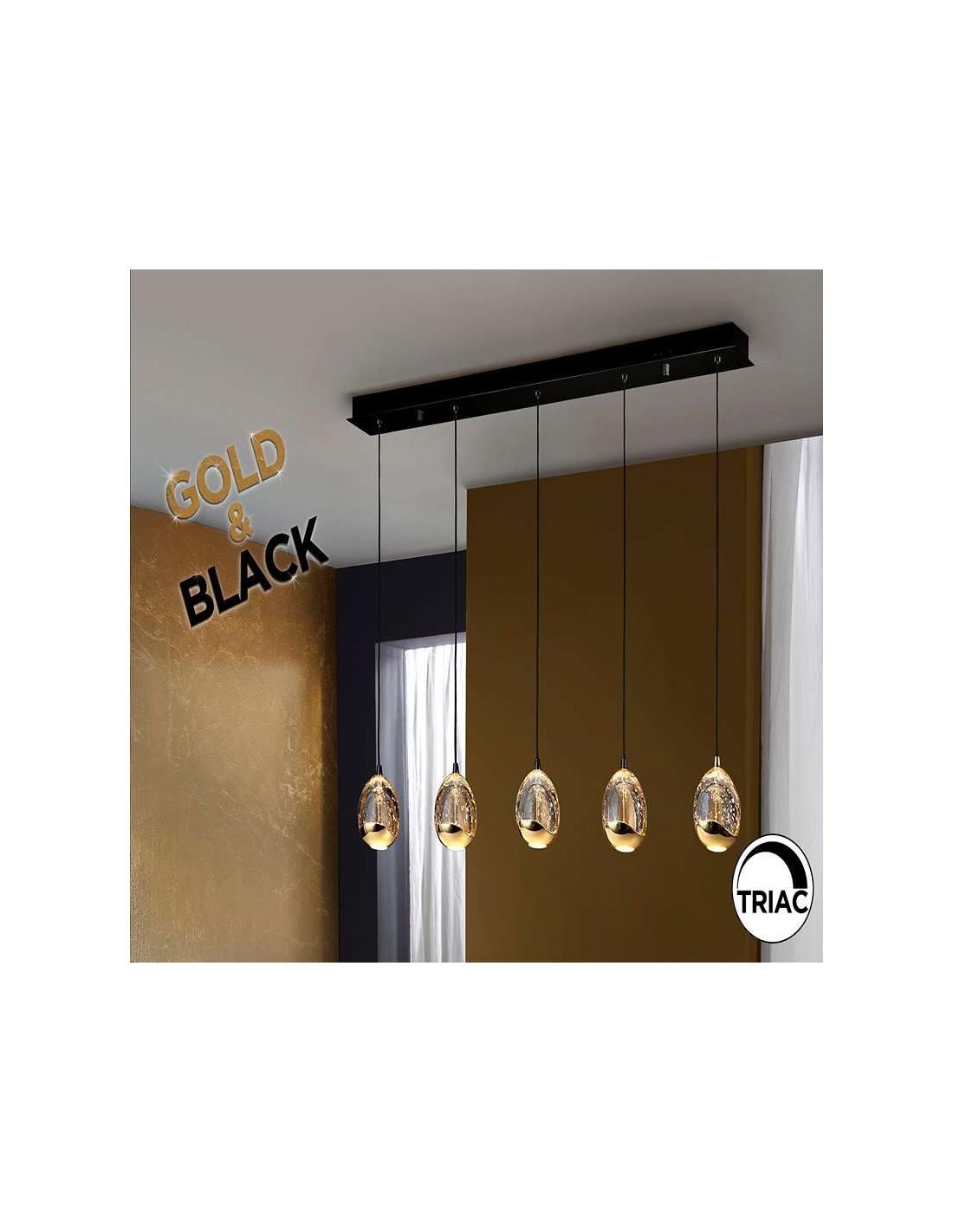 5-light LED lamp, made of metal, matte black finish and shiny gold. Drop-shaped tulips made of solid glass with decorative bubbles inside, in champagne tone. Adjustable in height. 25W LED. 2400 lm. 3000 K. DIMMABLE.