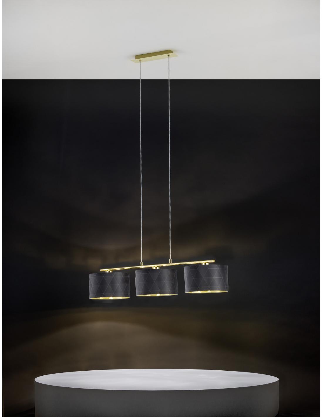 3X60W 220-240V,50/60Hz. It is characterized by the use of steel materials as the main part and textile for the screen. Combine colors such as Gold in the lamp and black, gold for the lampshade. Requires 3