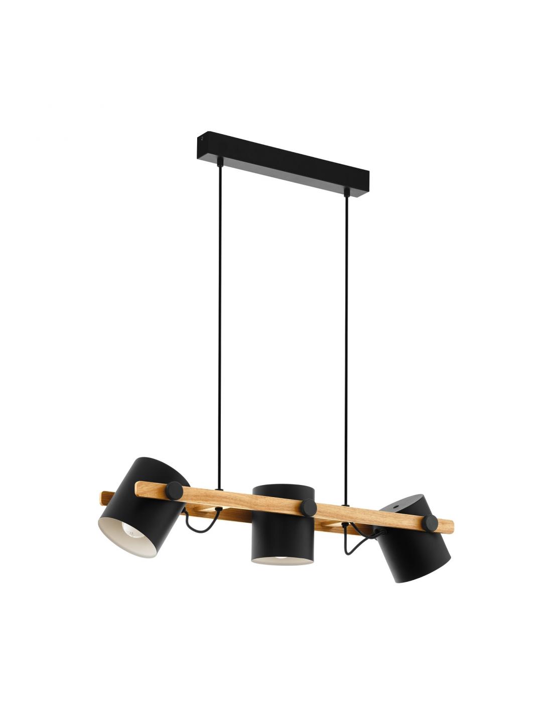 HORNWOOD is an industrial style pendant lamp with 3 lights. This pendant lamp with adjustable height wiring is designed with three black steel spotlights and a wooden structure that joins them. Its base is made of black steel to match the rest of the piece. A modern and functional lamp perfect for almost any decorative environment, especially industrial, Nordic and natural decorations or in neutral colors. It uses three E27 socket bulbs, not included.