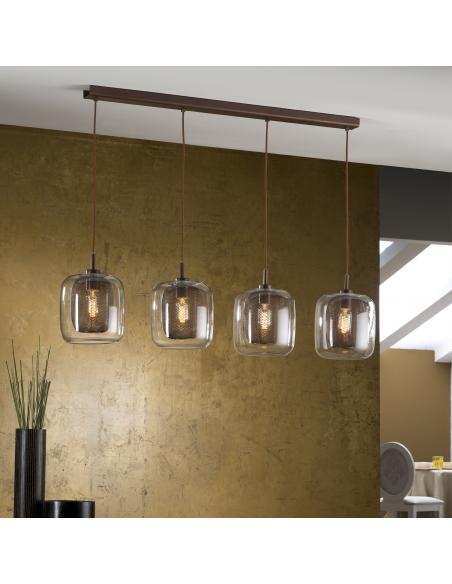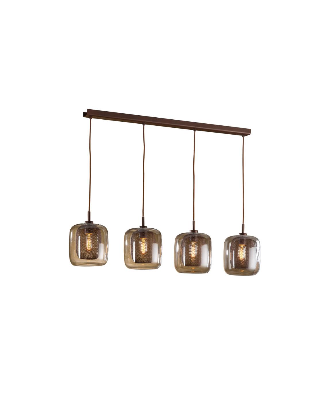 4-light lamp, made of lacquered metal, chocolate color. Double shade, metal mesh interior and glass exterior. ·Includes 4 E27 LED 8W. DIMMABLE