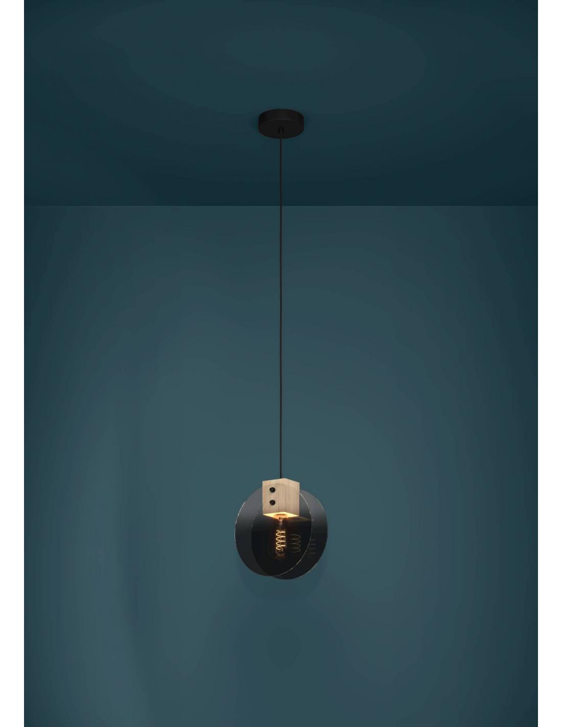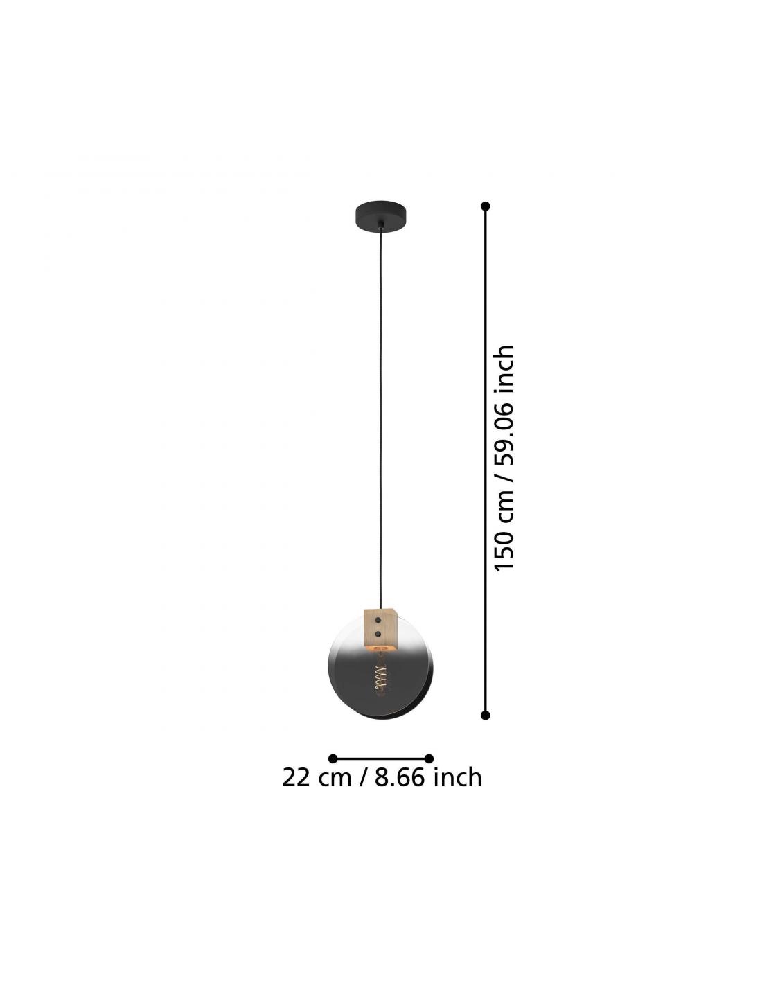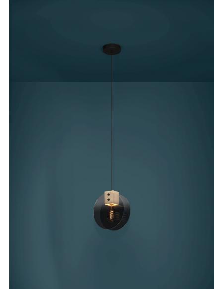 Pendant lamp with black steel base, vaporized glass shade in smoked finish in black color and wooden lamp holder with integrated E27 socket. A simple, modern and very functional piece. Illuminate your small rooms or use several lamps like this one to illuminate larger rooms. The bulb is not included and its cable is adjustable in height.