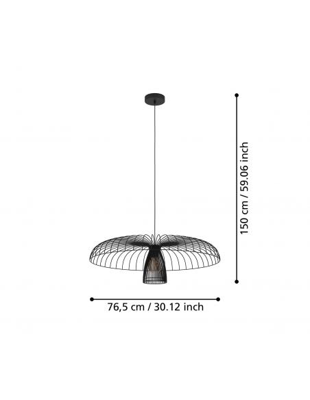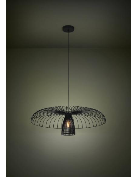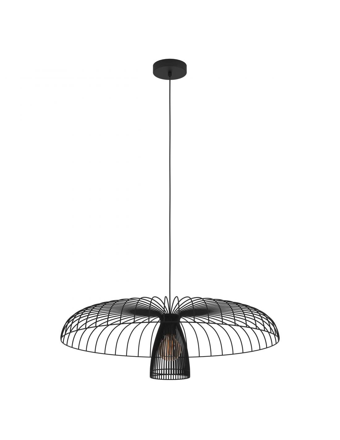 Black steel pendant lamp with a renewed industrial aesthetic. Its design is made in the shape of an umbrella and multiple steel rods rounded in a spectacular three-dimensional hole shape. This design is available in two sizes, 77 cm (this piece) and 98.5 cm, as they are 'big size' pendants for unconventional homes. You only need an E27 socket bulb, not included.