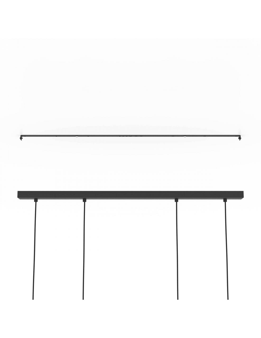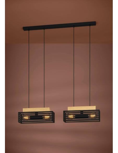 Four-light pendant lamp formed by two rectangular bodies of black gridded steel, from which two sockets emerge in each with a total of 4 lights for a very wide illumination of your dining table. In addition, the lampshades are attached to two wooden beams suspended from black wiring to match the upper steel base. This lamp will create a magical atmosphere thanks to the diffusion of its light through the grid, and will provide a decorative touch in the corner where you place it. Uses 4 E27 bulbs, not included.