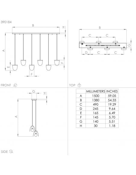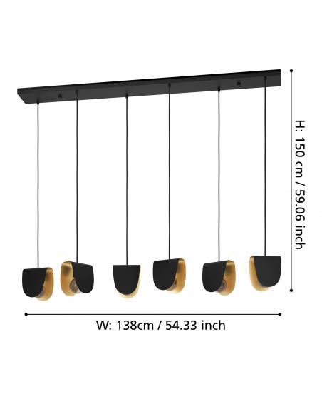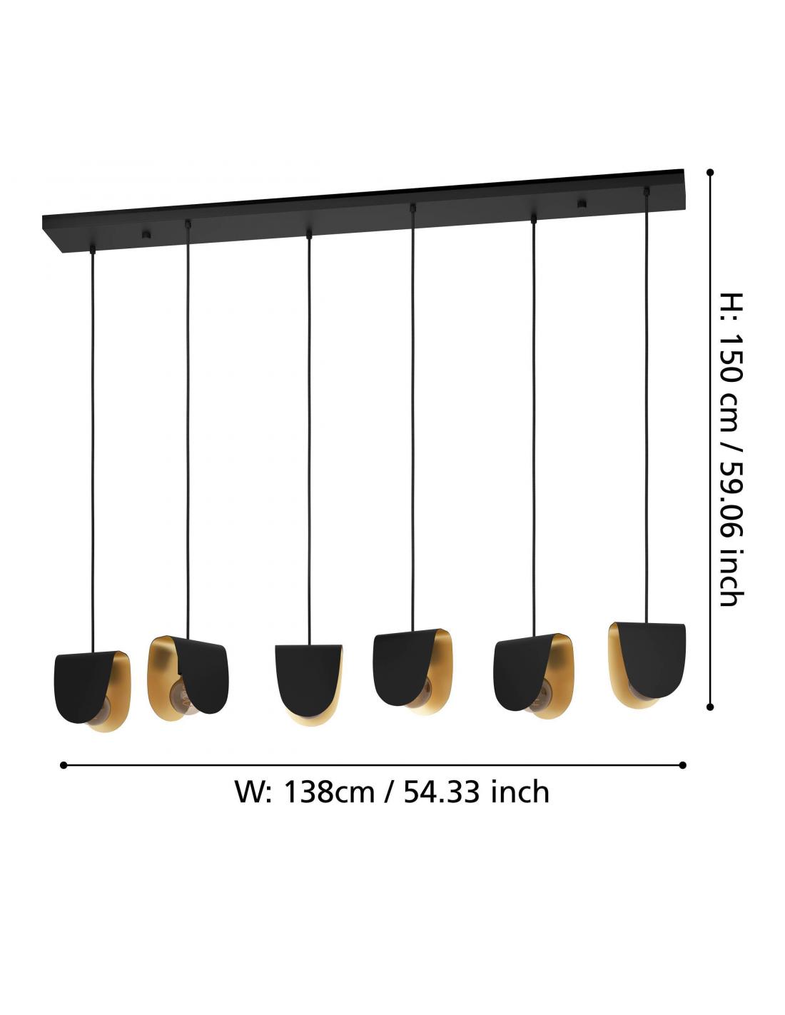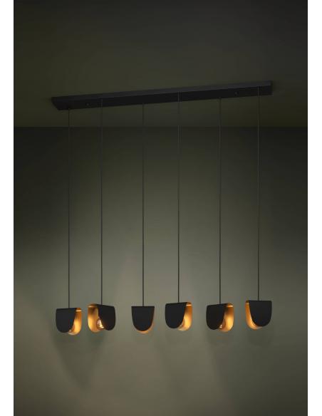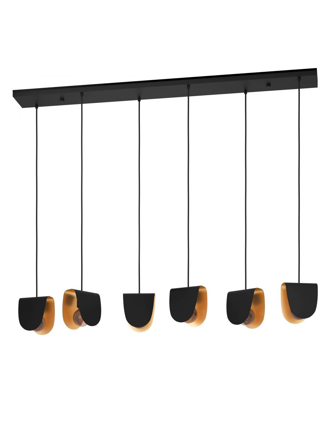 6-light pendant lamp made of steel, with a sturdy black base and shades of the same material and color, with a gold interior finish, which gives the piece a less serious and more distinguished look. Its six lampshades are inverted U-shaped and are perfect for diffusing light over your dining table and creating a warm and beautiful atmosphere. The 6 E27 socket bulbs are not included.