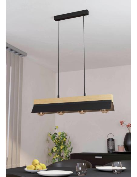 Very original 4-light pendant lamp thanks to its fan design with industrial materials such as steel, at its base and shades that form this unique figure, and wooden beam with integrated lamp holder that gives a less sober look to the piece, adaptable to various types of decoration but especially useful in industrial environments. We recommend the use of Edison or vintage bulbs for a better use of the aesthetics of the piece. Uses 4 e27 socket bulbs, not included.