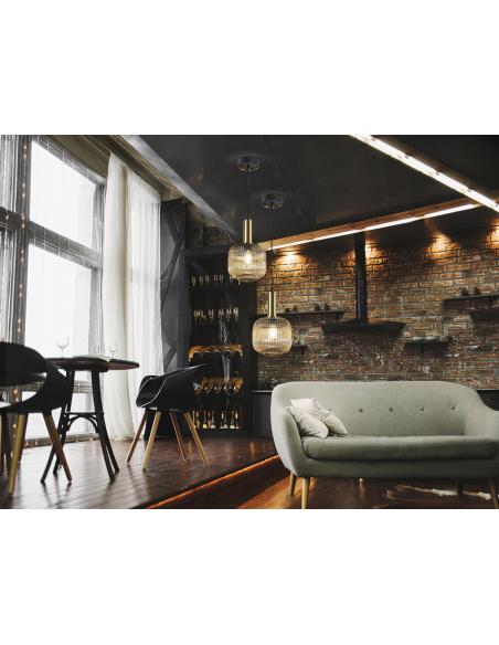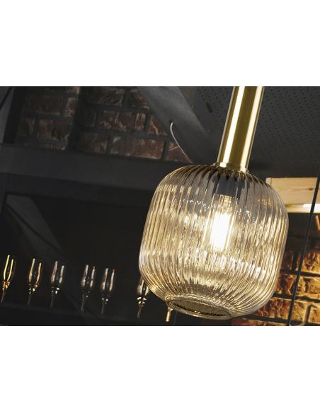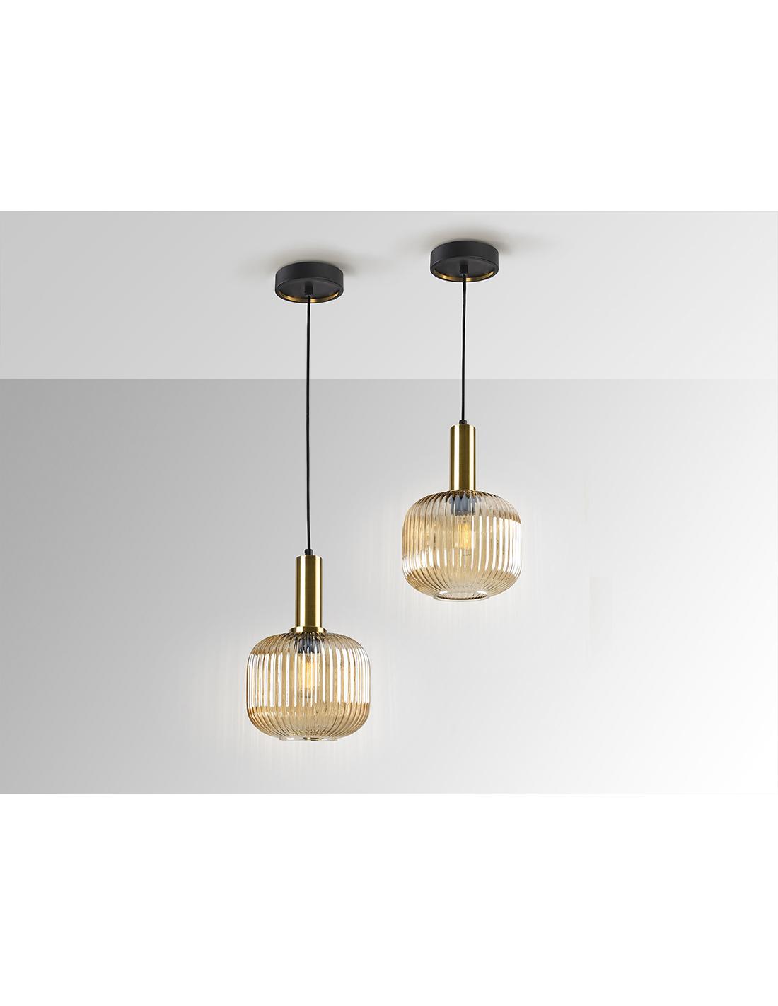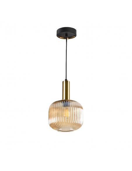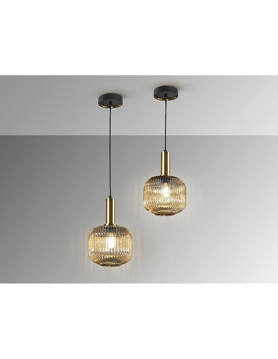1-light lamp made of matte black finished metal, with satin brass details. Amber molded glass shade. Adjustable in height. ·Includes 1 E27 LED 8W. DIMMABLE