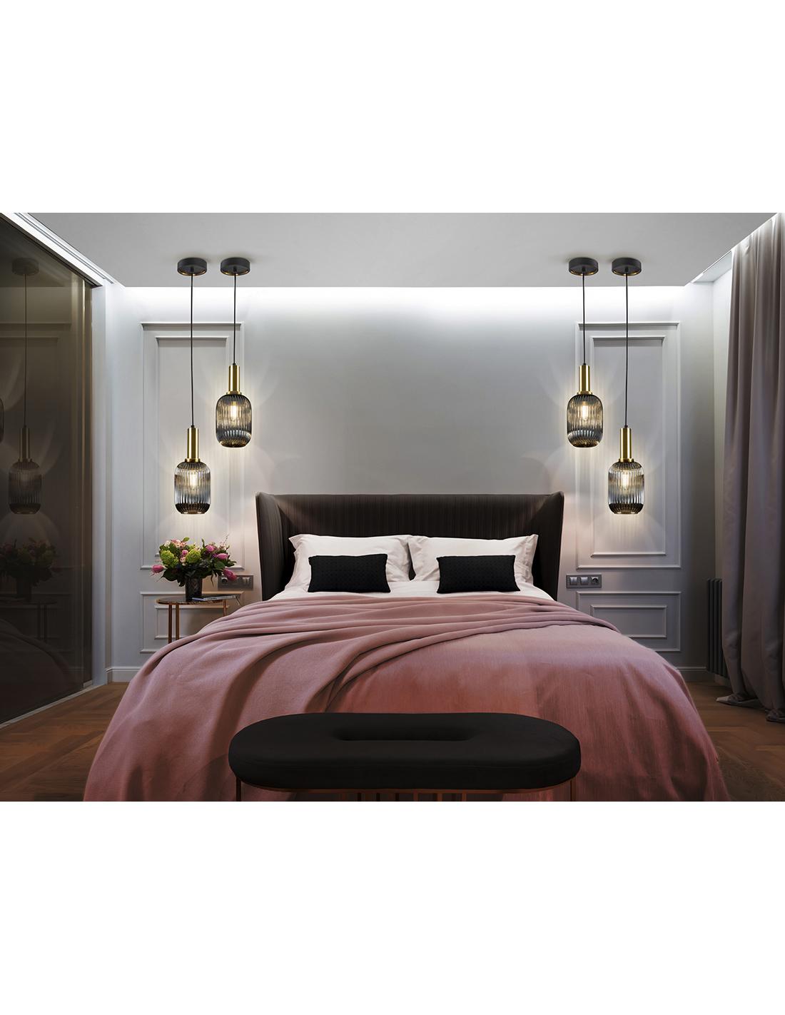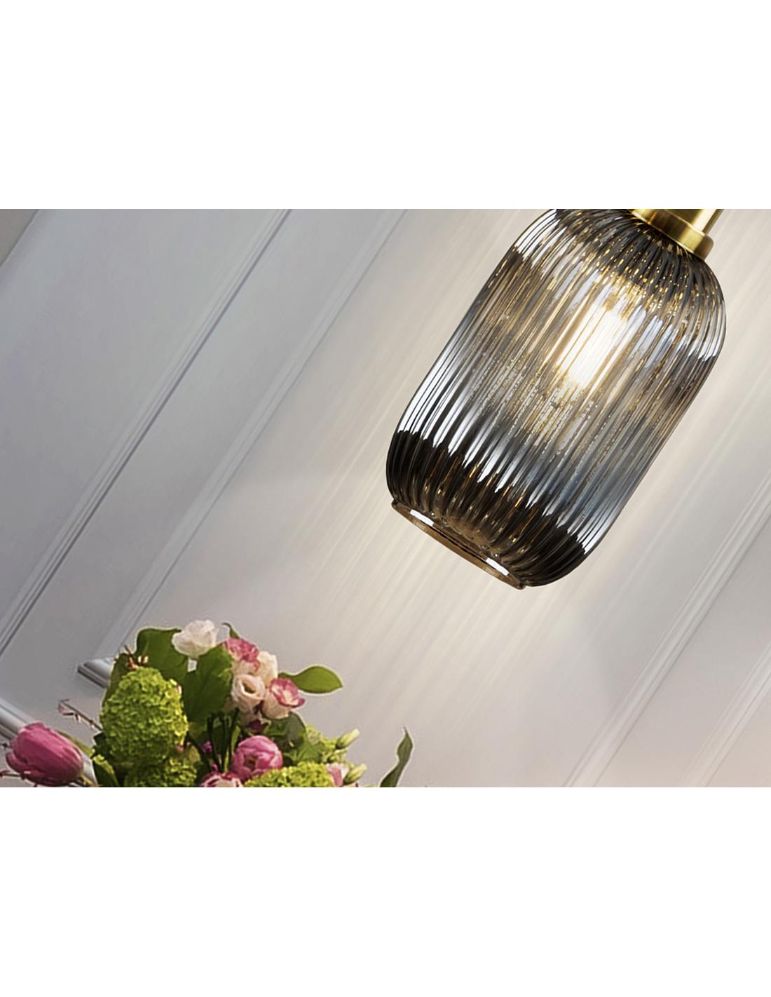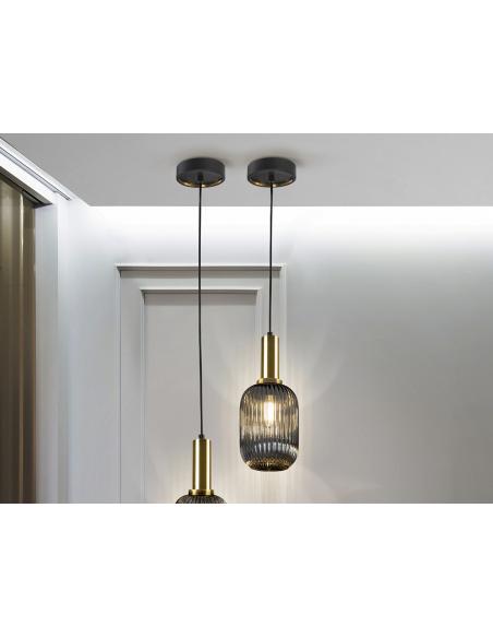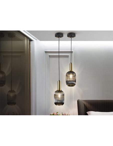 1-light lamp made of matte black finished metal, with satin brass details. Molded glass tulip with a smoke-grey mirrored finish. Adjustable in height. ·Includes 1 E27 LED 8W. DIMMABLE