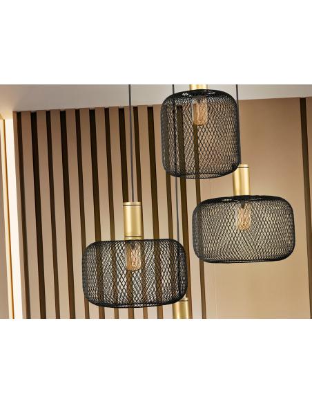 Round lamp with 4 lights made of metal, Includes 2 designs of metal mesh tulips. Matte gold and black paint finishes. Black textile sheathed cable. ·Includes 4 E27 LED 8W. DIMMABLE